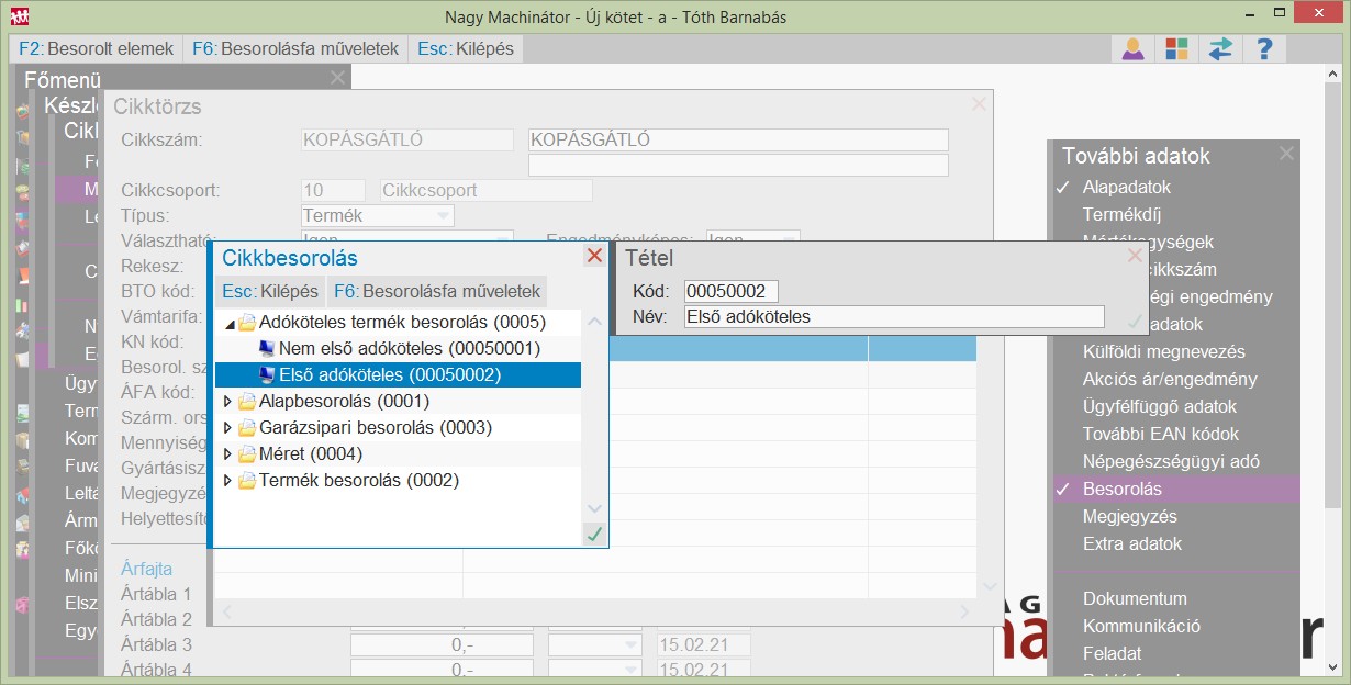 1, Létrehozunk egy cikkbesorolás törzset (Pl.: Törzs = Adóköteles termék) és abban két értéket (Első adóköteles | Nem első adóköteles)