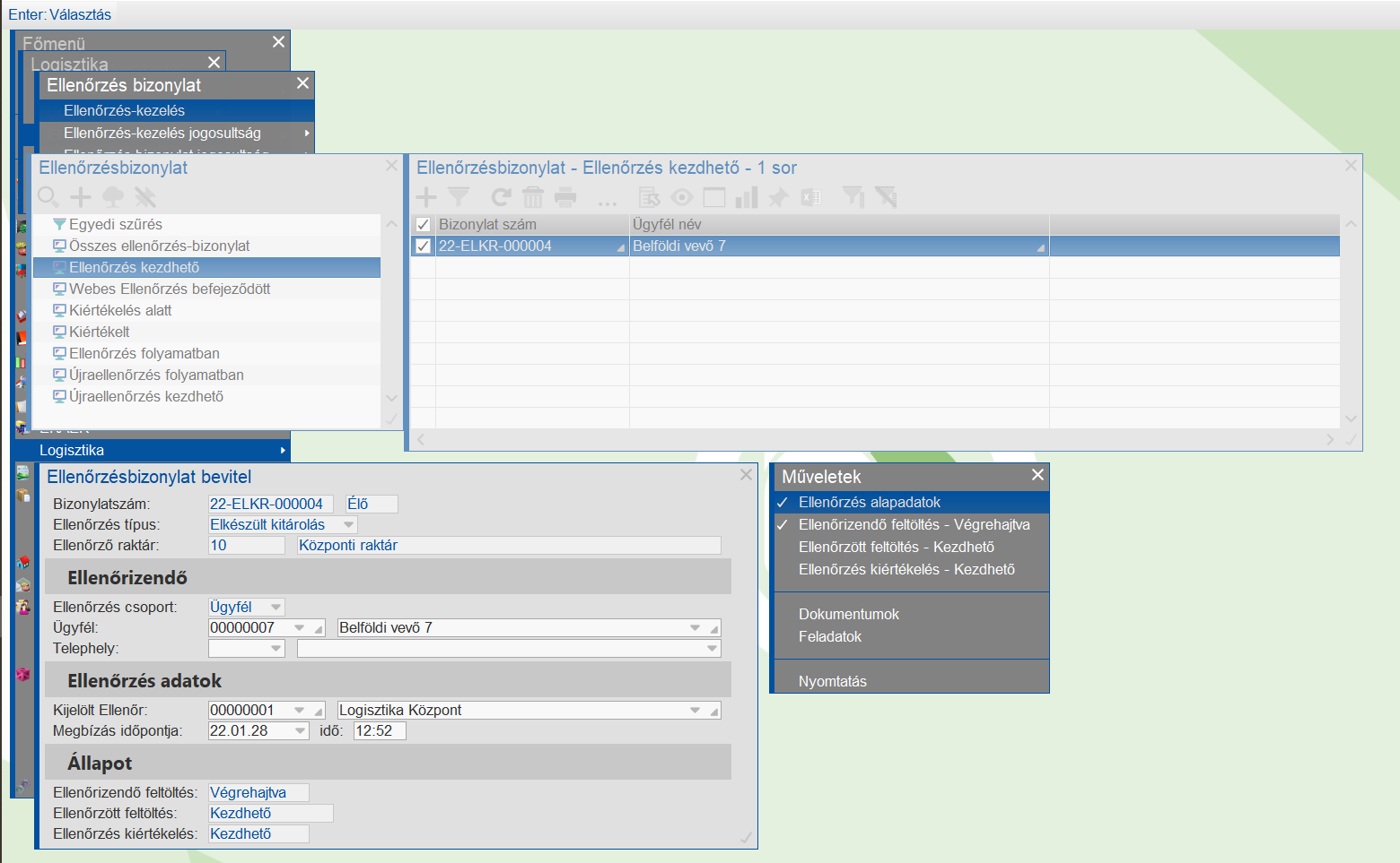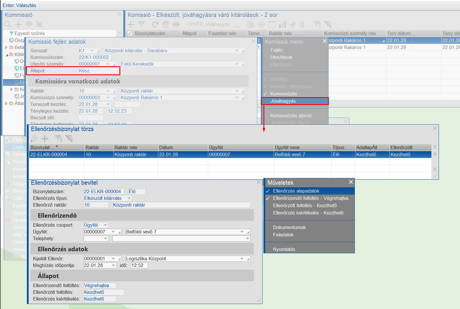 Ebben az esetben a komissiózás készrejelentése után automatikusan készül egy ellenőrzés bizonylat. - > lásd ezzel kapcsolatban Kiszállítás-szervezés