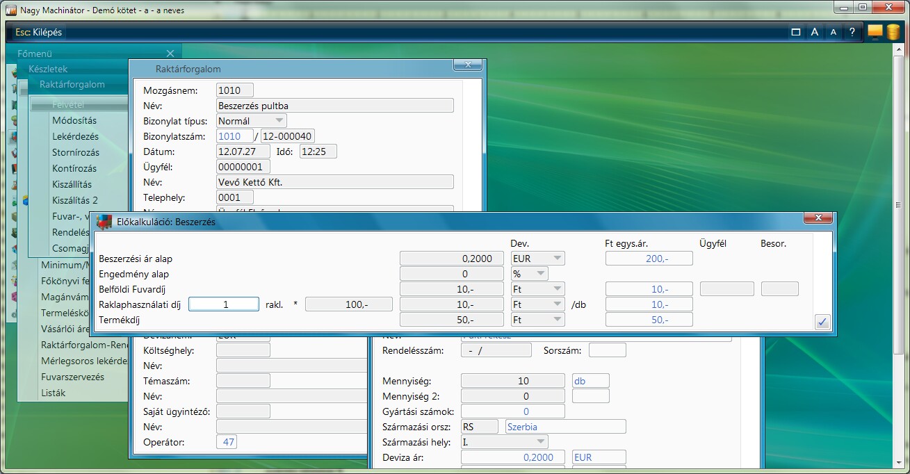 Tegyük fel, hogy a beszerzési árunkba a vásárolt anyag beszerzési árán kívül a belföldi fuvar is beletartozik. A fuvardíj úgy került meghatározásra, hogy raklaponként X Ft. Ebben az esetben, az előkalkulációnkban beszerzési ár két tételből áll. Az egyik a beszerzési ár, a másik a fuvardíj. A beszerzési árra vonatkozó részről egy áruszámlát, a fuvardíj részére egy fuvarszámlát fogunk kapni. A szállítólevél rögzítésekor a program az előkalkulációban definiáltak alapján tételenként részletezni fogja a beszerzési árat. Az árhoz tartozó tételek eltárolásra kerülnek és a számla iktatása során, amennyiben tétel kitöltéssel készül a számla, meg lehet határozni, hogy a szállítólevél tétel beszerzési árából az áruszámlára vagy a fuvarszámlára vonatkozó részt kell-e átemelni.