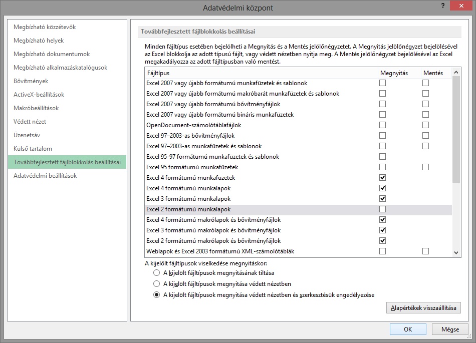 3.Az Excel 2 formátumú munkalapok sorból vegye ki a pipát és jelölje be A kijelölt fájltípusok megnyitása védett nézetben és szerkesztésük engedélyezése választógombot.