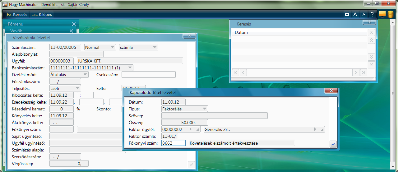Faktorálás:Faktorszámla összegével beállítás esetén az egyenleget a faktorálás összegével módosítja a program. Ez normál esetben elegendő is, hiszen az Ügyfél már nem tartozik a számlával, helyette a Faktor cégnél jelenik meg az egyenleg.