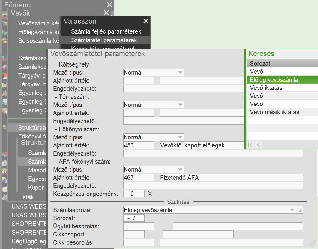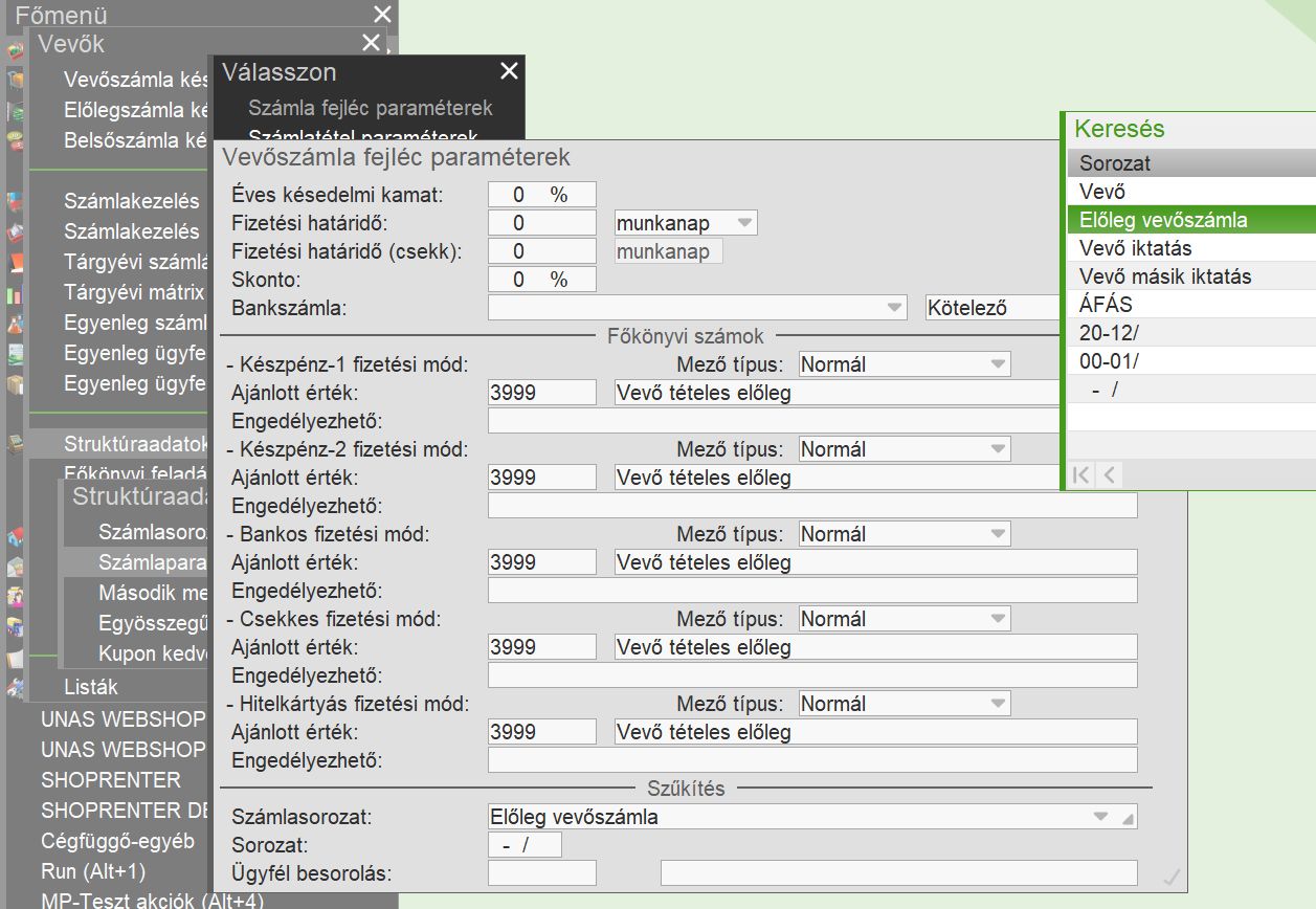 A helyes működéshez olyan bekérő sorozatot kell létrehozni, melyhez kapcsolt előlegszámla sorozat a vevő modulban kerül kiállításra, így kontírszámokkal is ellátható. -> Részletek