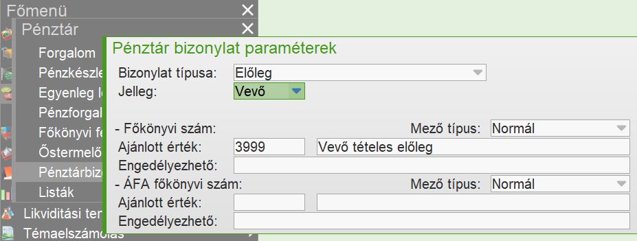 Az előleg típusú (új típusú, azaz Áfa megadás=Előlegszámlában) pénztártételek automatikus előkontírozása a Pénztárbizonylat paraméterek funkcióban érhető el, azonban miután a pénztártételhez előlegszámla kapcsolódik (előlegbekérőből generálva vagy egyből az előlegszámlához kapcsolással), a pénztártétel kontírozása felülíródik, átvéve az előlegszámla fejlécében megadott főkönyvi számot.