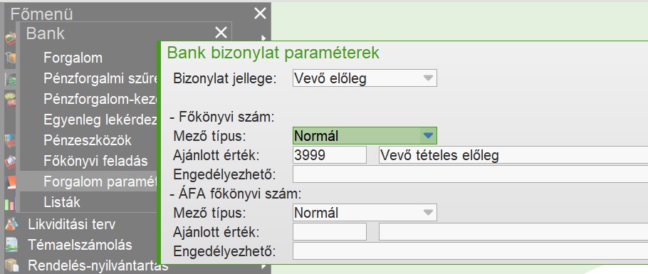 Az előleg típusú (új típusú, azaz Áfa megadás=Előlegszámlában) banktételek automatikus előkontírozása a Bankforgalom paraméterek funkcióban érhető el, azonban miután a banktételhez előlegszámla kapcsolódik (előlegbekérőből generálva vagy egyből az előlegszámlához kapcsolással), a banktétel kontírozása felülíródik, átvéve az előlegszámla fejlécében megadott főkönyvi számot.