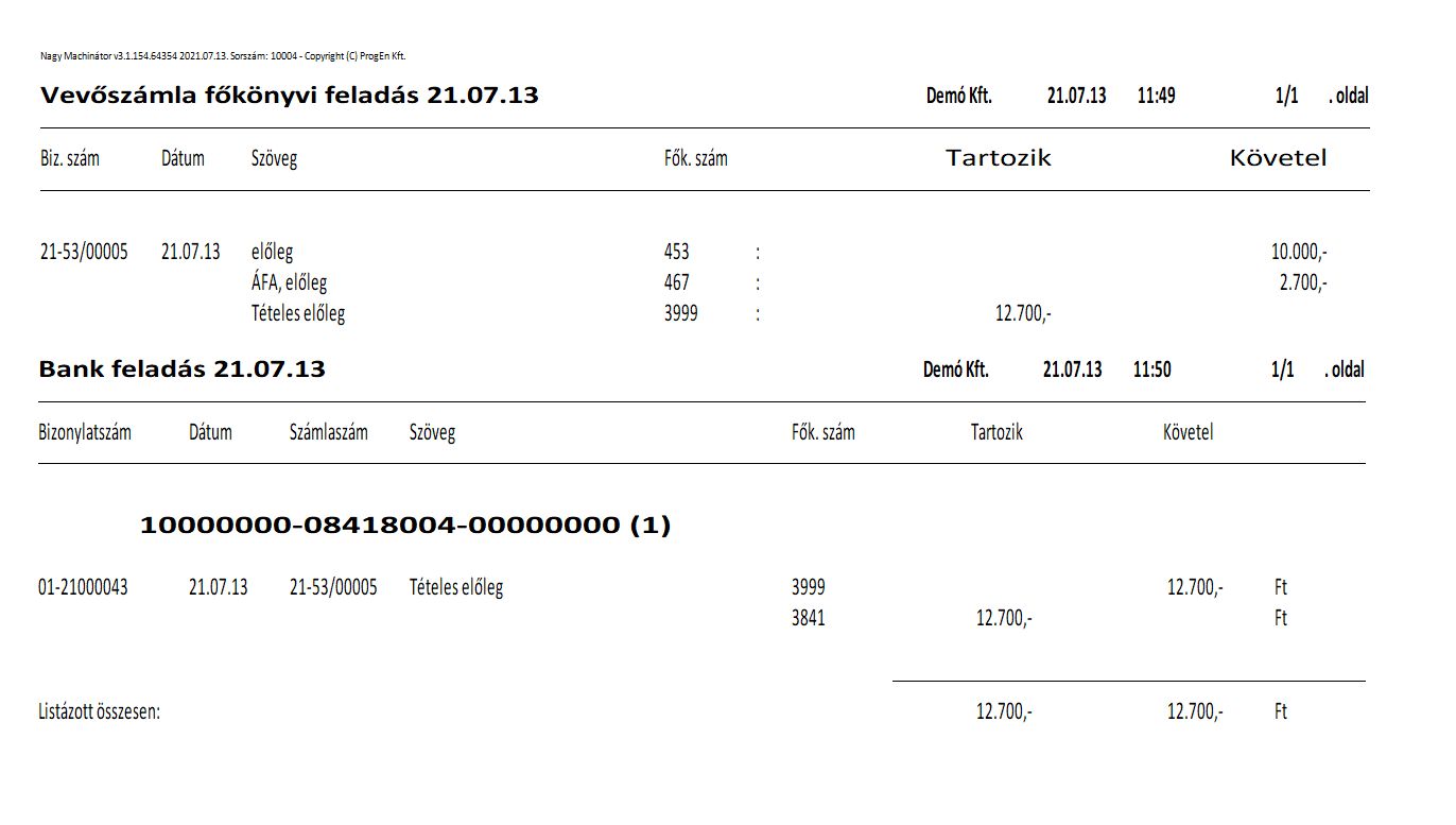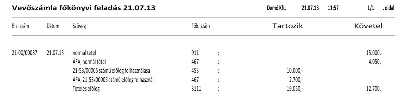 A felhasznált előleg a számlába külön (negatív) tételként kerül bele, így az előlegfelhasználás feladását a Vevő főkönyvi feladás végzi.