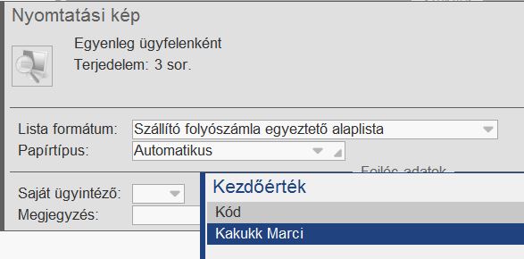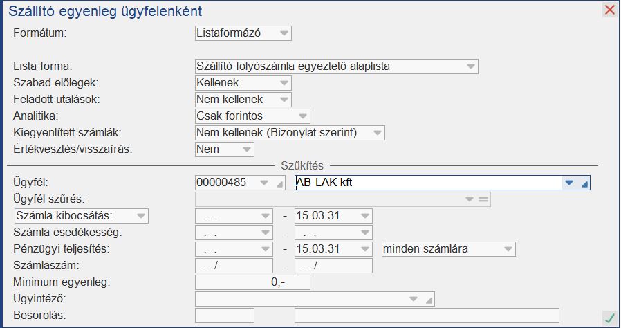 A szállító egyenleg ügyfelenként lista formázott változatai között választható egy "Szállító folyószámla egyeztető alaplista" változat, mely levél formátumban közli a kiválasztott szállító(in)k felé fennálló tartozásunkat:
