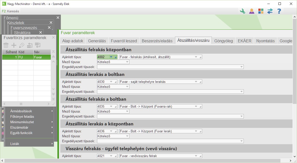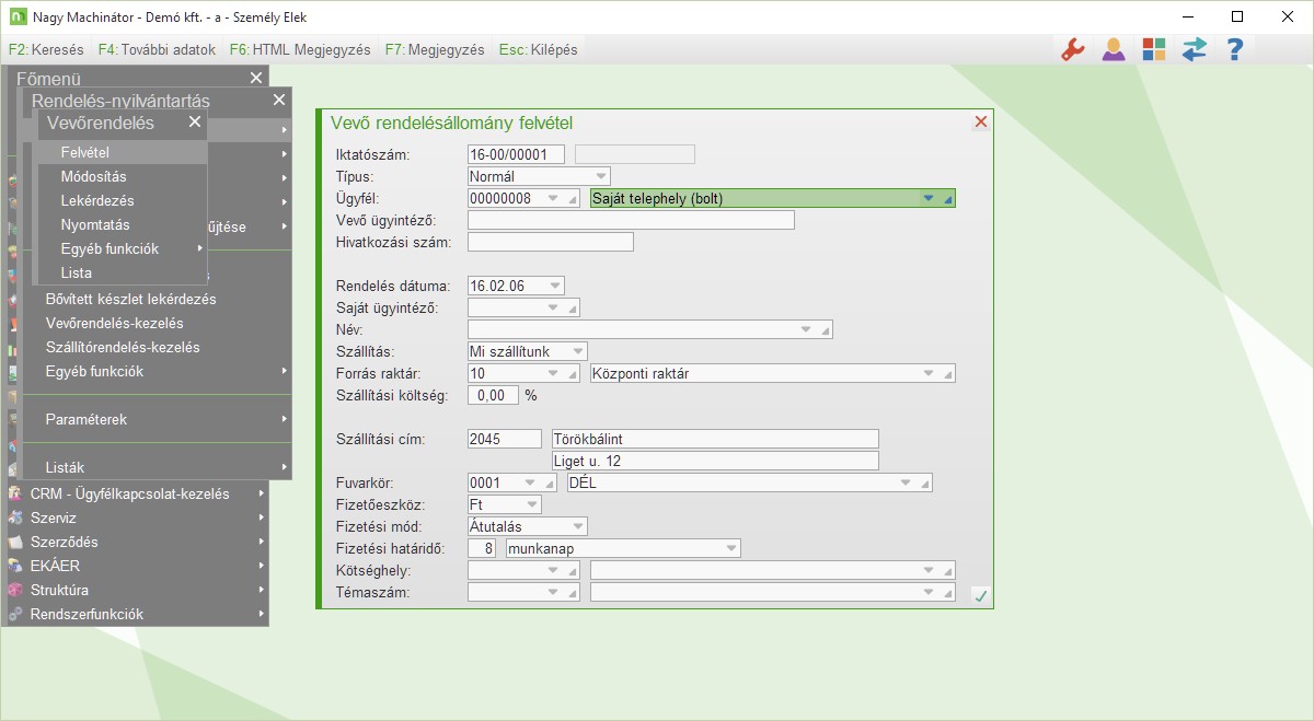 Boltokból igényének rögzítéseA boltok igényeit a vevőrendelések között kell rögzíteni. A boltot mint ügyfél kell felvenni a rendelésen. Raktárnak azt kell megadni ahonnan az árut szállítani kell. Ezenkívül a Mi szállítunk és a Fuvarkör megadása fontos.
