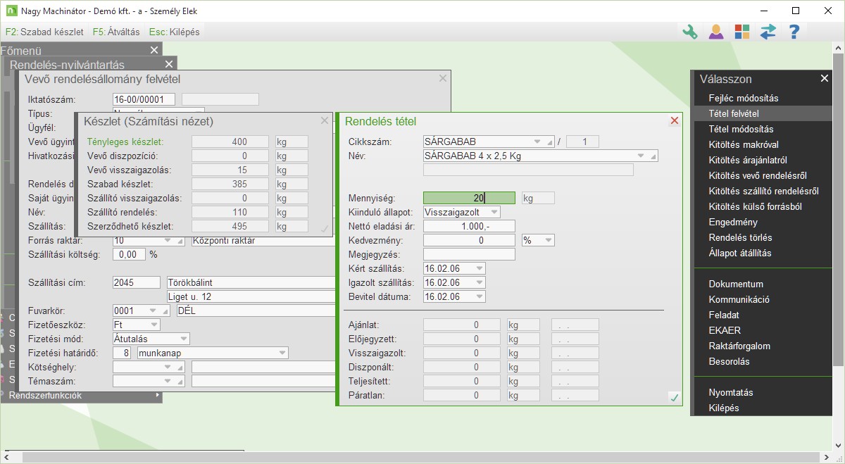 A bolt igényének rögzítése közben láthatjuk, hogy egyéb vevők mennyi készletet foglalnak a raktárban.