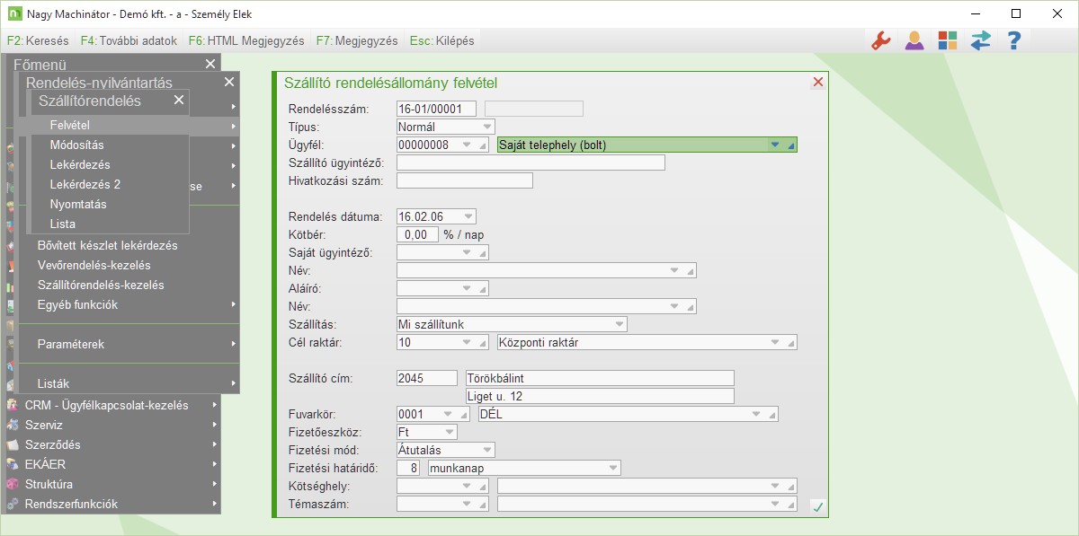 Boltokból visszahozandó áru rögzítéseA boltokból visszahozandó árukat a szállítórendelések között kell rögzíteni. A boltot mint ügyfél kell felvenni a rendelésen. Raktárnak azt kell megadni ahonnan az árut szállítani kell. Ezenkívül a Mi szállítunk és a Fuvarkör megadása fontos. - > Boltokból visszahozandó áruk rögzítése