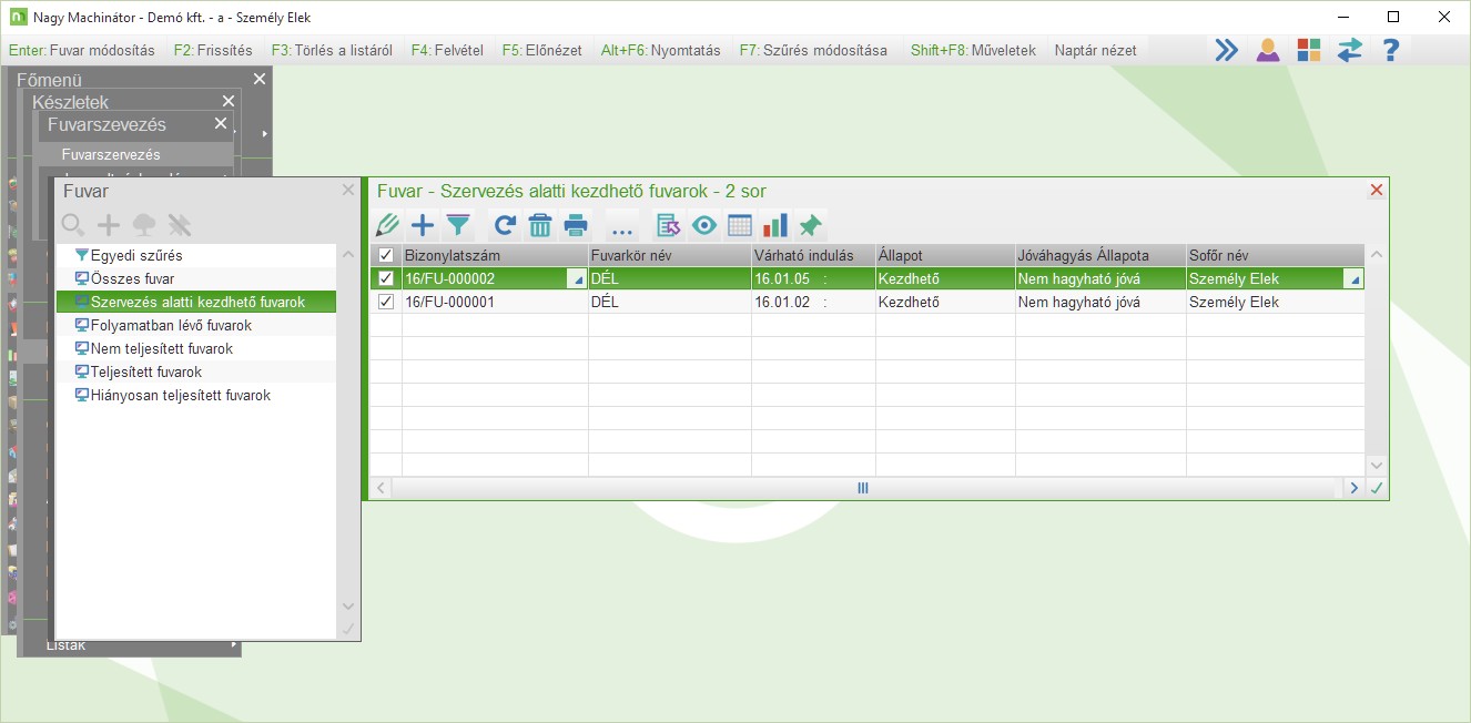 Fuvar lekérdezéseA képen látható menüpontban lehet lekérdezni a kezdhető állapotú fuvarokat.