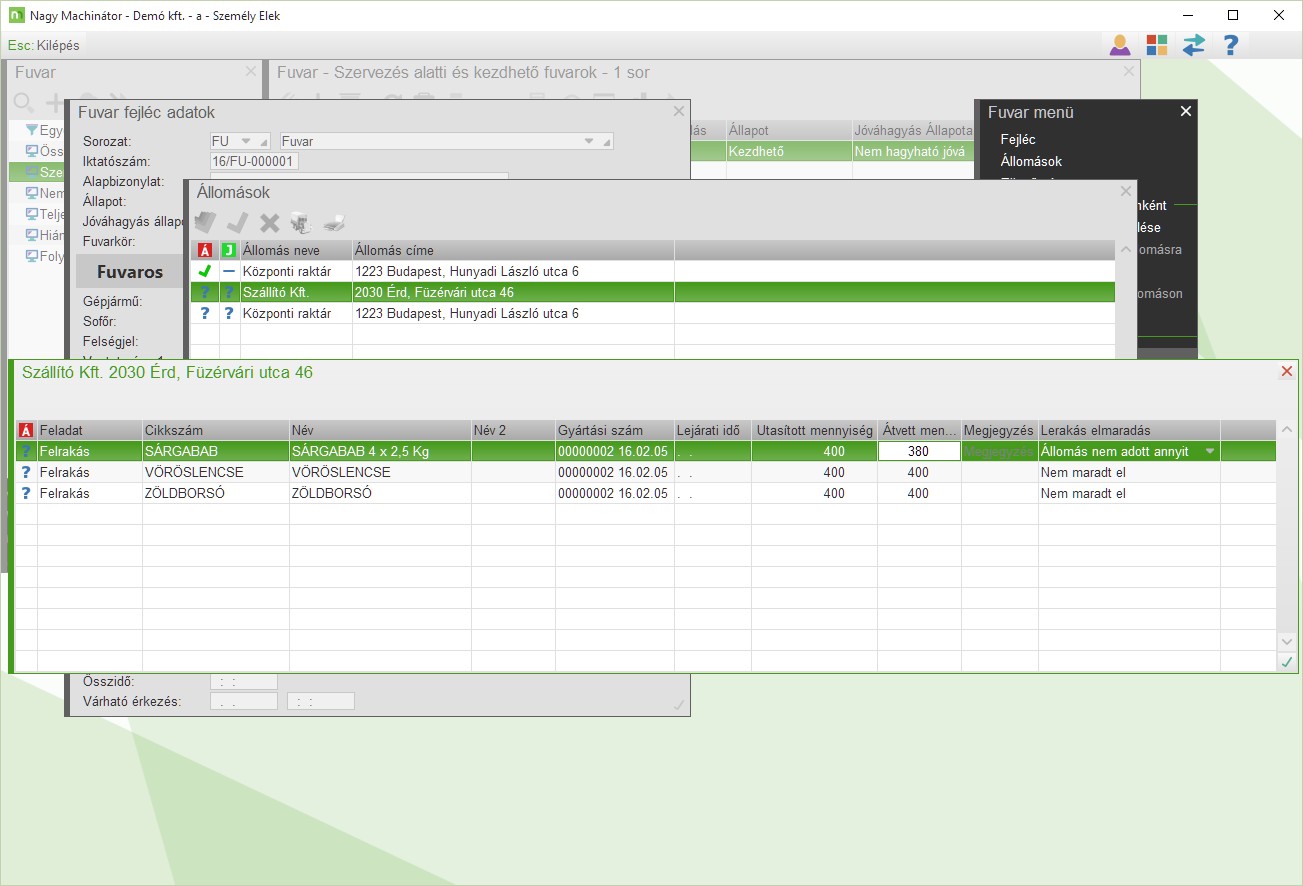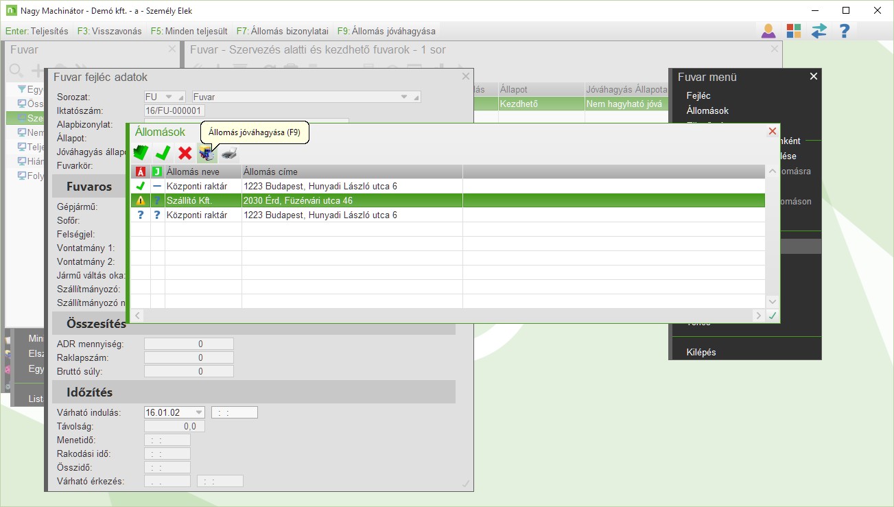 Állomások jóváhagyásaEgy állomás jóváhagyásának két lehetősége van: Állomásonkénti jóváhagyás, Csoportos jóváhagyás A két módszer ugyanazt az eredményt okozza.A felhasznló dönti el, hogy melyik megoldás áll hozz közelebb. Állomásonkénti jóváhagyásAz állomásonkénti jóváhagyás a kismenüben történik. Használatát sofőröknek ajánljuk, akik egy laptop és mobilinternet segítségével valósidőben akarják az egyes eseményeket rögzíteni a programban: - megérkezés az állomásra - ki/berakodás megkezdése - indulás az állomásról. - állomás teljesítése Csoportos jóváhagyásCsoprtos jóváhagyás egy menüpont a kismenüben. A megjelenő ablakban akár egyszerre az összesállomás teljesíthető és jóváhagyható. Utólagos (esemény követő) adatrögzítés esetén ajánlott. A csoportos végrehajtáshoz a következő forgalmakat kell tisztázni: Teljesítés, Lezárás Teljesítés (Pipálás)során adjuk meg, hogy milyen ,értékben sikerült teljesíteni a kiírt feladatot. Lezárás (F9) során a teljesített tételekkel lezárja a program az állomást és legenerálja a szállítólevelet. Két lehetőség van. Vagy állomásonként végrehajtják a feladatokat, vagy egyszerre az összes állomást. Állomásonkénti végrehajtás Az egyes állomásokon enter után meg lehet adni tételesen, hogy mit sikerült elvégezni a kiírt feladatból. Pl.: az alábbi képen látható, hogy az 400 kg zöldborsó helyett csak 380 kg-ot vett át a soför. Állomásban a következő művelet van Teljesítés, Lezárás Teljesítés (Pipálás)során adjuk meg, hogy milyen ,értékben sikerült teljesíteni a kiírt feladatot. Lezárás (F9) során a teljesített tételekkel lezárja a program az állomást. Az összes tétel "kipipálása" után F9-Lezárással lehet lezárni az állomást és visszalépni az Állomások ablakba