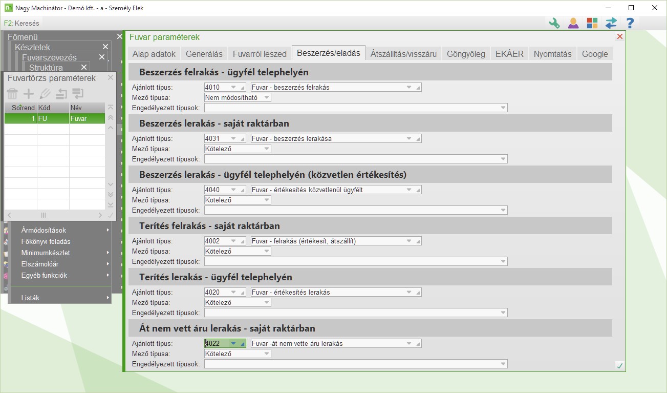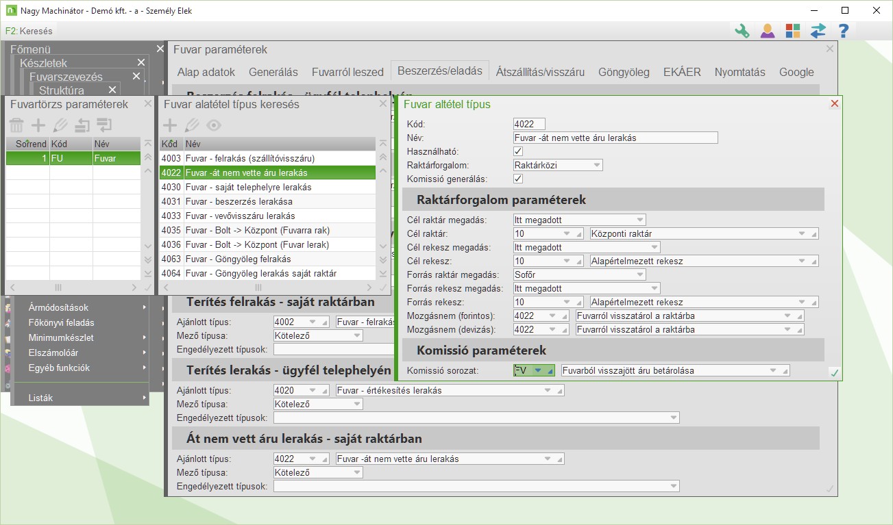 VégállomásMiután visszaérkezik a soför lepakolja az árut. Amit lepakol, arról betárolási utasítást fog generálni a program a komissiómodulban. A következő folyamatok indulnak el: Beszerzés lerakás - saját raktárban Át nem vett áru lerakás - saját raktárban Átszállítás lerakás központban Visszáru lerakás - saját raktárban (vevő visszáru)