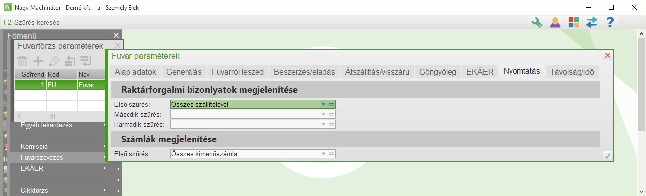 Szállítólevél nyomtatásAz állomás jóváhagyása után elkészülnek a készletmodulban a raktárforgalmi bizonylatok (szállítólevelek). A képen látható menüpont elindítása után egy szűrés ablakban megjelennek a fuvarhoz tartozó szállítólevelek. Innen lehetőség van a szállítólevél nyomtatására. |