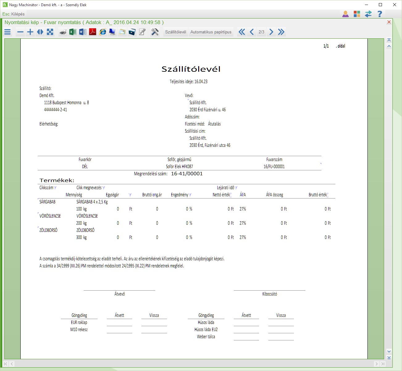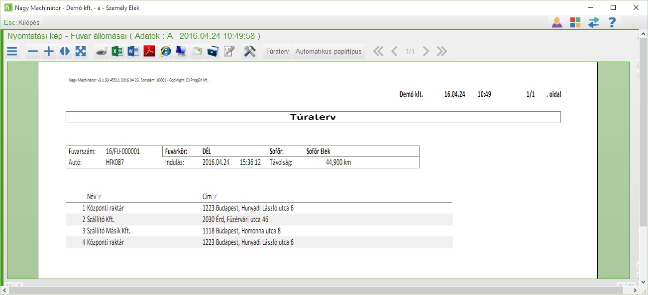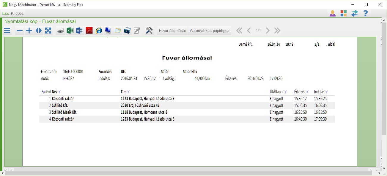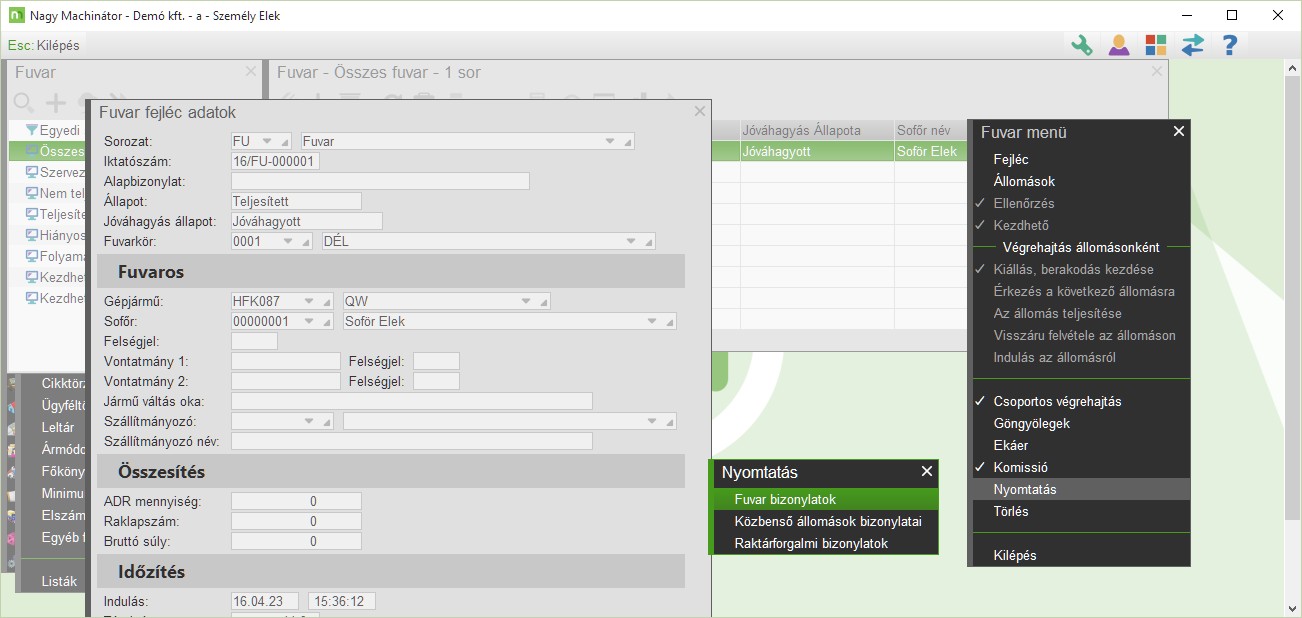 Fuvarbizonylatok nyomtatásaA fuvar megkezdése előtt számos bizonylatot lehet nyomtatni. A felhasználó saját bizonylatot is tud szerkeszteni a listaformázóban. |