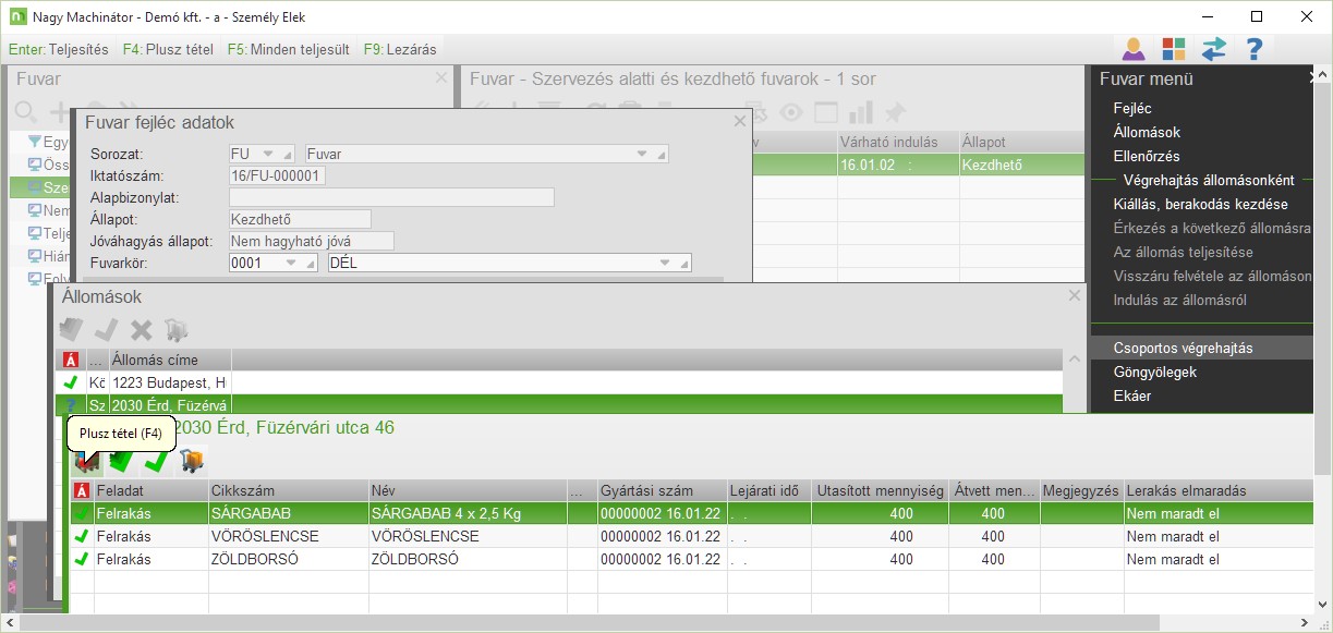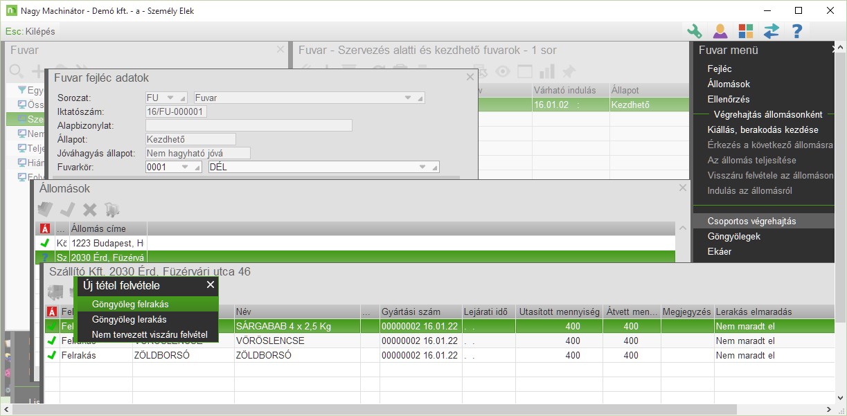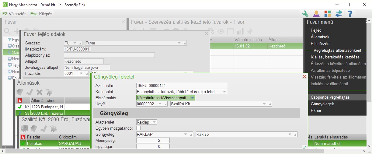 Göngyöleg felrakás fuvarraA sofőrnek leehetősége az állomások teljesítése során az állomáson kapott göngyölegeket a fuvarra rátenni. |