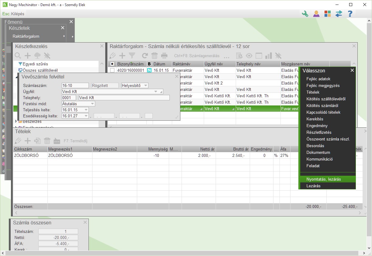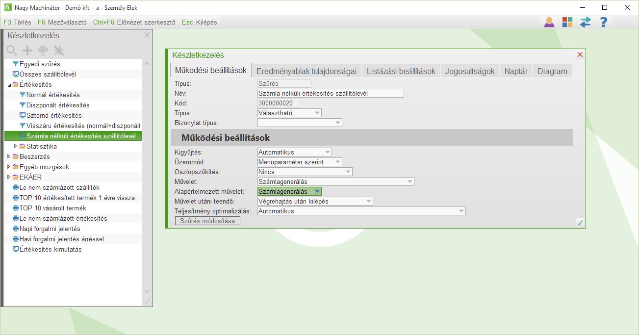 A Számlagenerálás művelet beállítása és a Művelet uitáni teendő: Végrehajtás után kilépés beállítása fontos.
