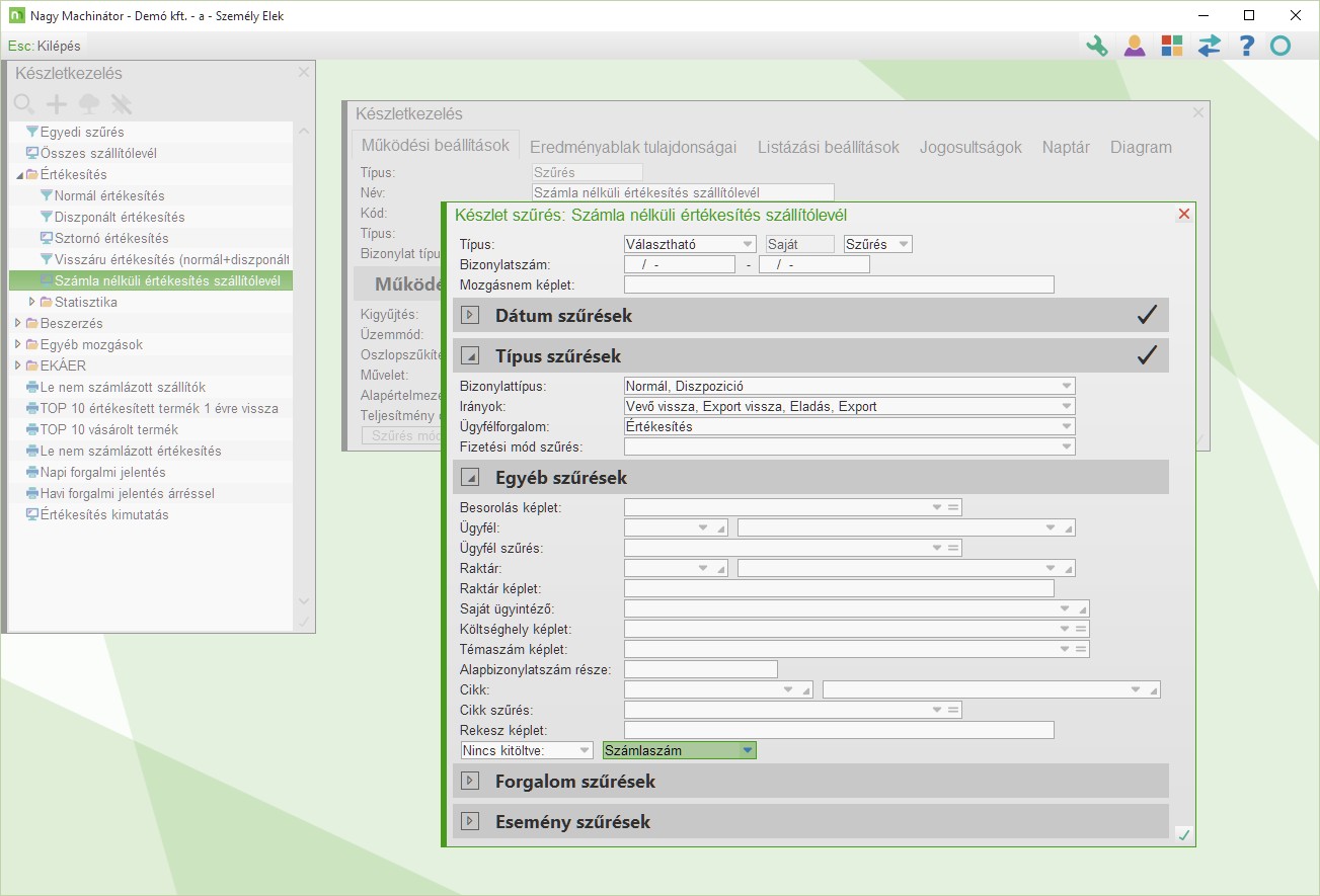 Raktárforgalom szűrés beállítása