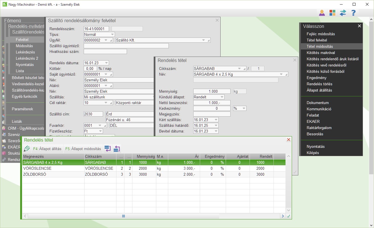 Szállítórendelés rögzítéseAz ügyfélszolgálat az áruforgalmi igények alapján rögzíti a rendelést a szállítórendelés-nyilvántartás modulban. A rendelésfejlécében a címadatok megadása után a program megajánlja az iránytószám (vagy a területi kód alapján) a fuvarkört. A fuvarkör alapján megajánlásra kerül a szállítási határidő. Fontos, hogy Mi szállítunk beállítás szerepeljen a fejlécben és a rendelés állapota Rendelt vagy Visszaigazolt legyen. Szállítórendelést egyéb módokon is lehet rögzíteni - > Szállítórendelés készítés módjai |