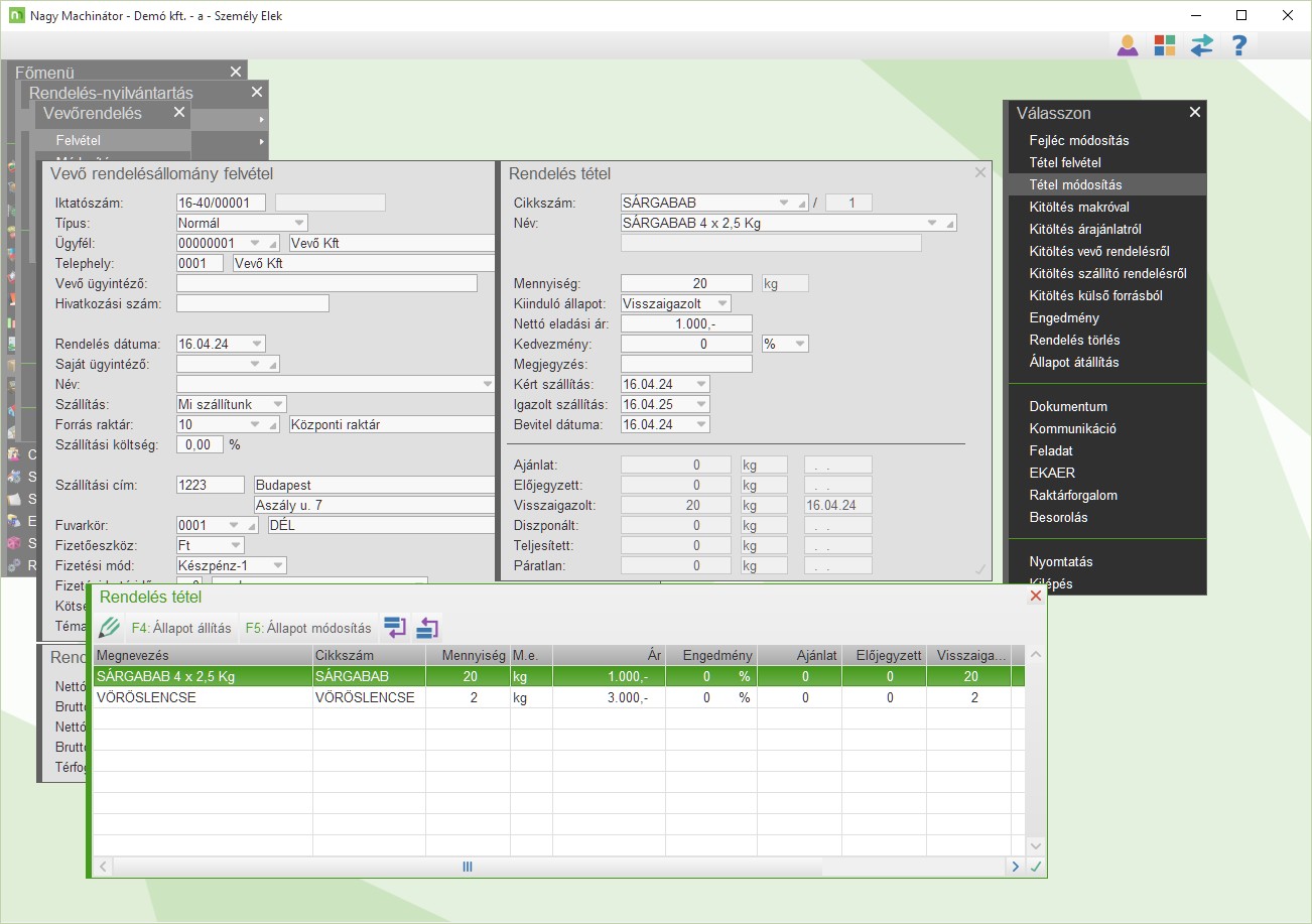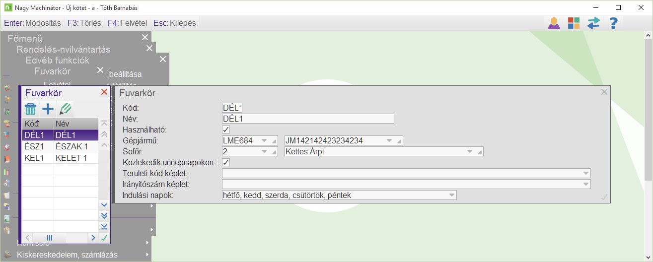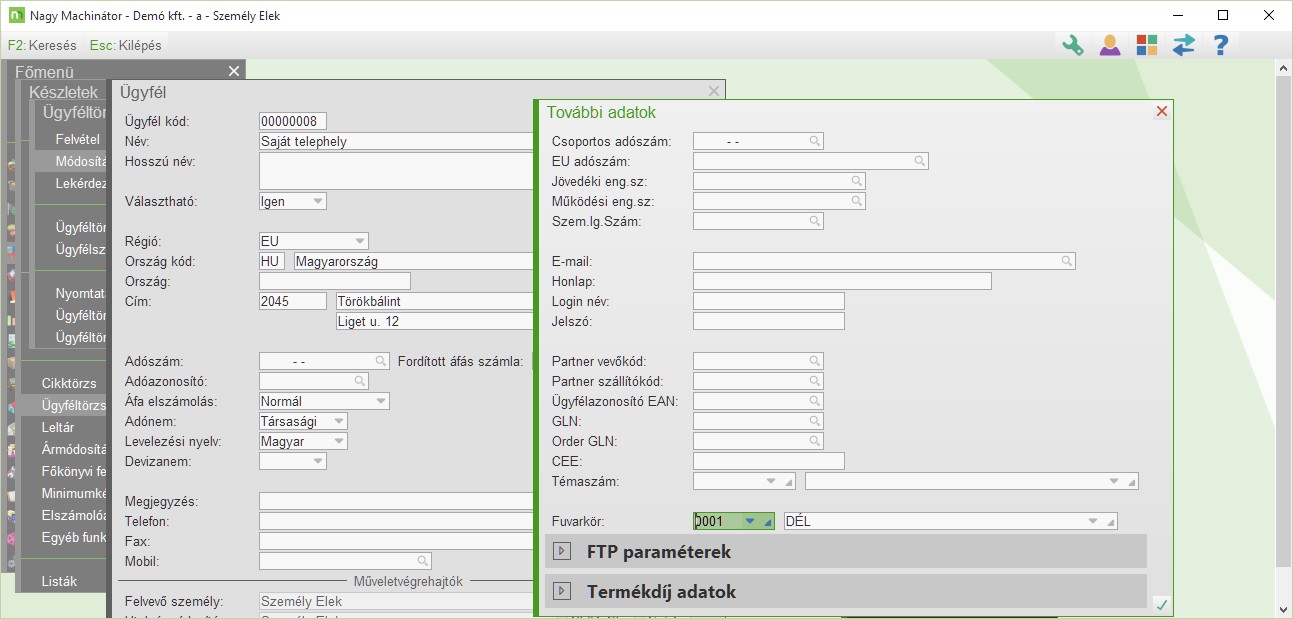Vevőrendelések rögzítéseAz ügyfélszolgálat telefonon/emailen kapott igények alapján rögzíti a rendelést a vevőrendelés-nyilvántartás modulban. A rendelés fejlécében a címadatok megadása után a program megajánlja az iránytószám (vagy a területi kód alapján) a fuvarkört. A fuvarkörben megadott szállítási napok alapján kerül megajánlásra a szállítás dátuma. Rendeléseket egyéb módon is lehet rögzíteni a rendszerbe - > Vevőrendelés rögzítés módjai