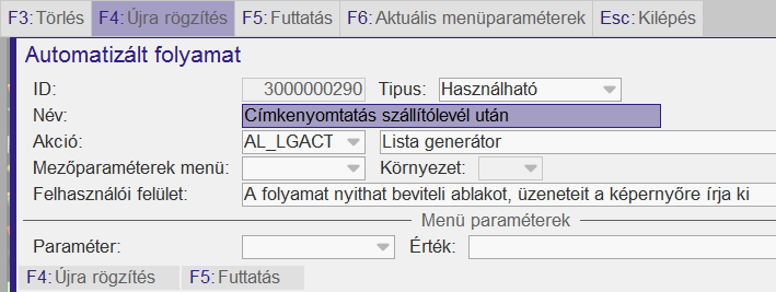 Itt azonban szállítólevélhez kell készíteni egyedi listaformátumként (LG lista) egy címkét, melyet a normál szállítólevél után ki tudunk nyomtatni. Az automatikus nyomtatás eseményvezérelt feladattal oldható meg, melynél először létre kell hozni egy olyan folyamatot, mely a meghatározott listagenerátoros formázott listát nyomtatja,