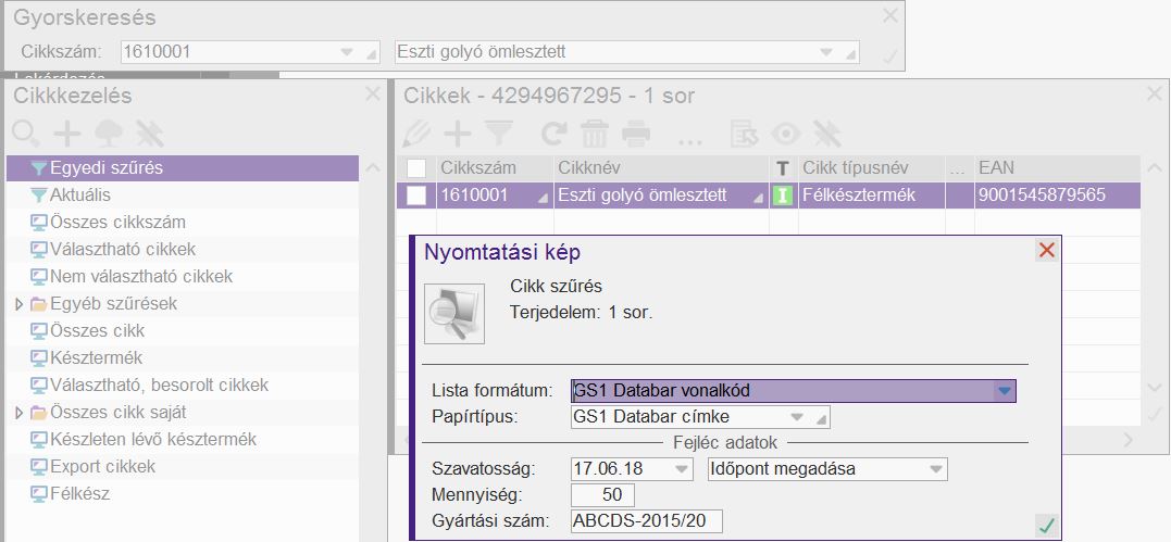 A GS1 Databar alkalmazása nélkül az EAN13 vonalkóddal kiválaszthatjuk ugyan a beszerzendő terméket, azonban az azonosításon túl a többi (forgalmi) adatok már kézzel kell megadnunk. A GS1 Databarral cikk-szűrésben a nyomtatandó cikket kiválasztva (F2) egy speciális listaformával kinyomtathatjuk azt a címkét, ami olyan összetett vonalkódot tartalmaz, mely a cikk hagyományos vonalkódja mellett tartalmazza az aktuális beszerzési tételen rögzítendő mennyiséget, gyártási számot és szavatossági időt is. Az egyes beszerzéseken azonban értelemszerűen egy cikk különböző mennyiségekkel, gyártási számokkal és szavatossági időkkel vételeződik be, így arra van szükség, hogy a beszerzés előtt olyan vonalkódot nyomtassunk, amely a cikk száma mellett bekéri a fenti adatokat is, és így készíti el az összetett vonalkódot.