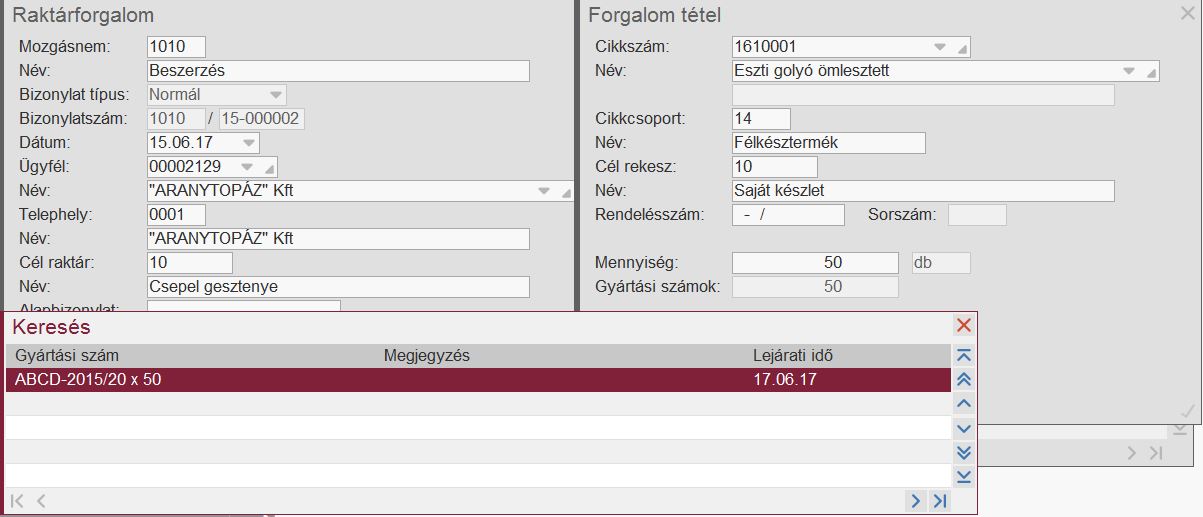 A címke kinyomtatása után a Raktárforgalom/Felvételben egy beszerzés mozgás létrehozása után a tétel felvételnél csak le kell olvasni a vonalkódot és a három változó forgalmi adat is bekerül a tételbe: