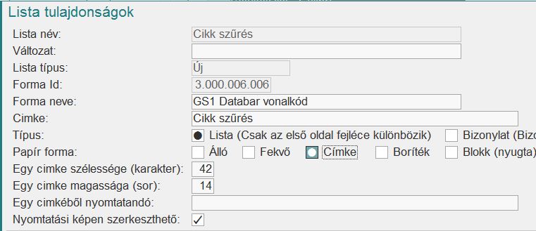 A listaformátum szerkesztésénél fontos, hogy a lista tulajdonságaiban a Papír forma Címke legyen és a címke szélessége és magassága igény szerint legyen megadva.