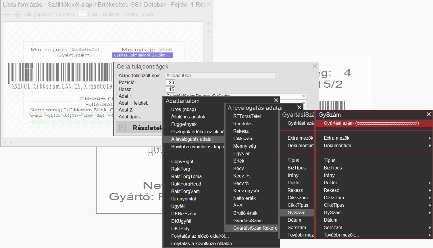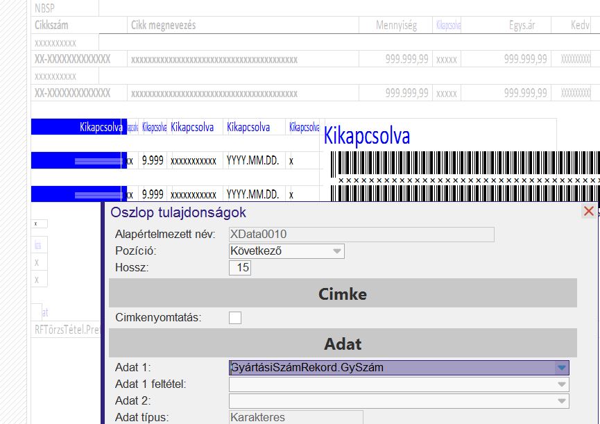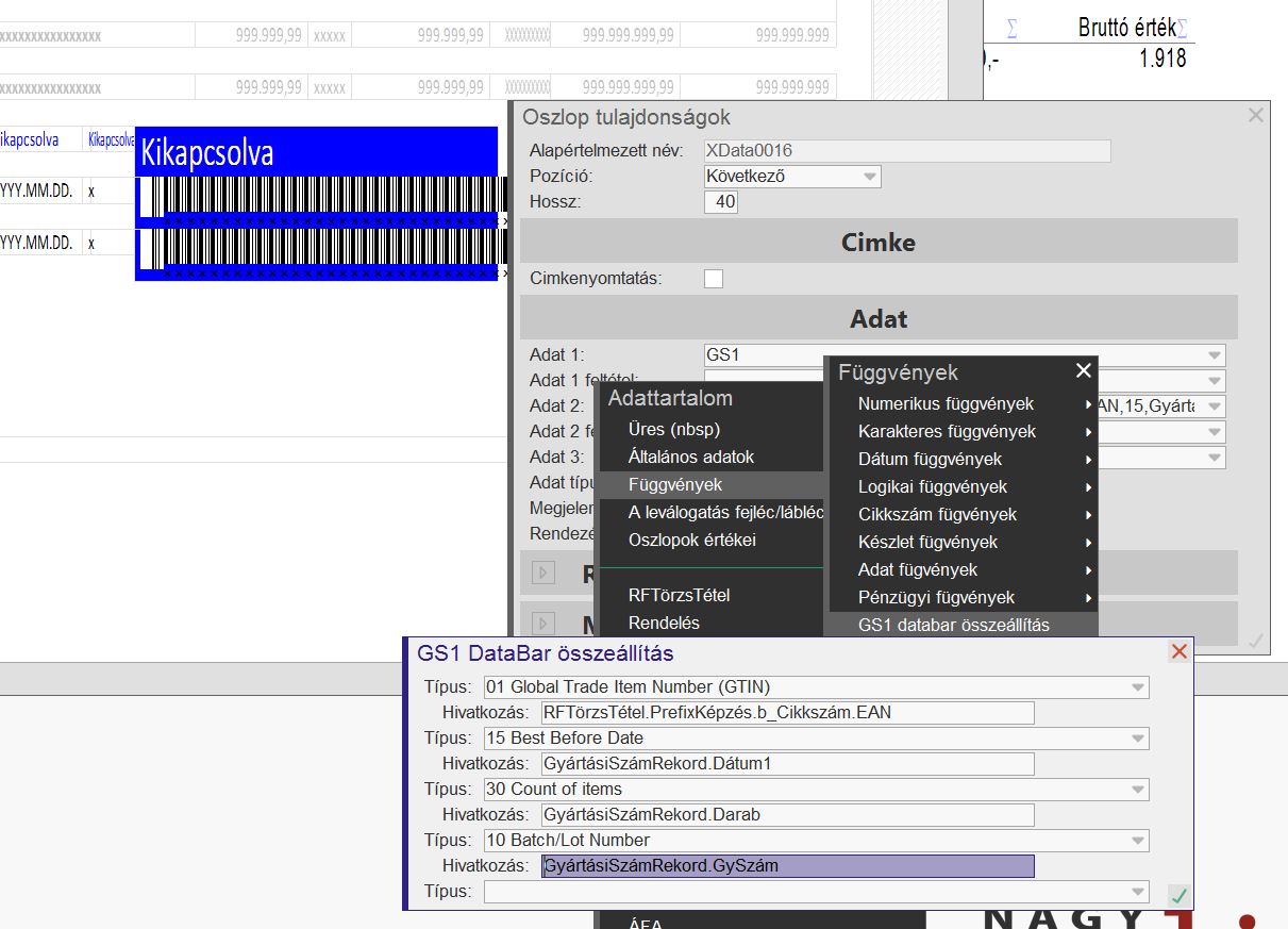 A bekért, ill. cikktörzsből származó adatokat (pl. EAN13 vonalkód) a GS1 databar összeállítás nevű függvénnyel lehet a formára kitenni.