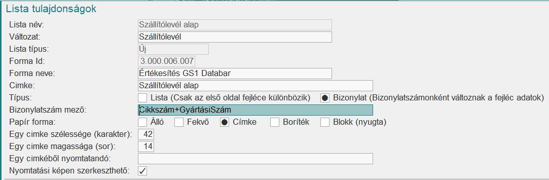Mivel ennél a feladatnál több különböző címkét fogunk nyomtatni (alaphelyzetben annyit, ahány tétel van a szállítólevélen, de ha egy cikk több gyártási számból tevődik össze, akkor többet), a formátum lista tulajdonságaiban meg kell oldani, hogy szükség szerint több címke jöjjön létre.