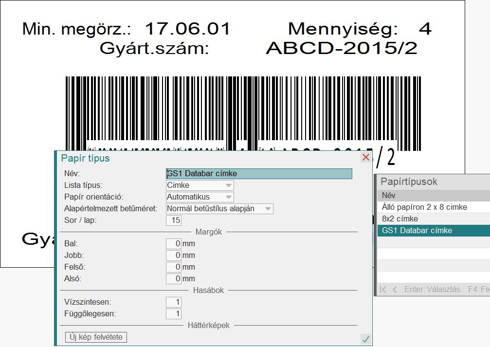 Fontos, hogy a címke adatai a forma fejlécébe kerüljenek, ill a GS1 Databar adatok cella részletezésénél a Betűstílusnál be kell kapcsolni a Vonalkód-ot (ekkor automatikusan bekapcsolódik a Code128 is). A címke papírtípusát a kívánt méretűre (és igény esetén több soros-több oszloposra) kell állítani.