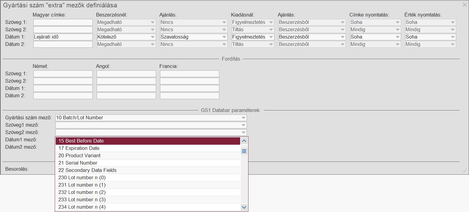 Első lépésként meg kell határozni azokat a gyártási szám extra mezőket, amelyekhez GS1 Databar kódot szeretnénk társítani. A gyártási szám extra paraméterek GS1 Databar paraméterek blokkjában 5 mezőt lehet rögzíteni. A gyártási számon kívül az extra paraméterek között korábban is használható két szöveges és két dátum típusú mezőhöz lehet GS1 Databar azonosítót társítani.