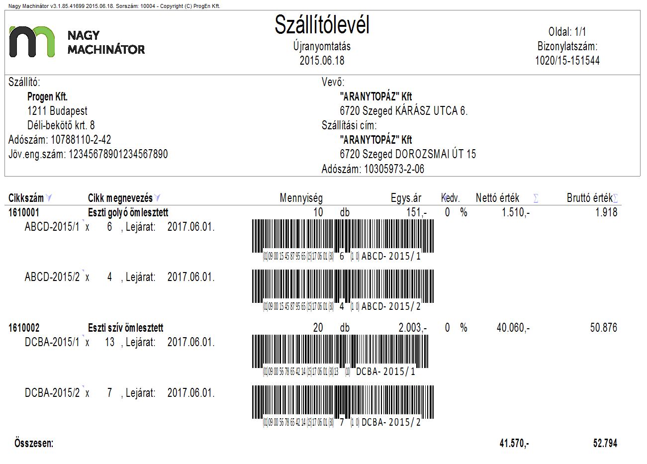 Amennyiben a szükséges szállítólevél van beállítva az értékesítés mozgásnem törzsadat tulajdonságaiban, egyszerűen csak ki kell nyomtatni a szállítólevelet és az összetett vonalkódok megjelennek a tételek alatt.