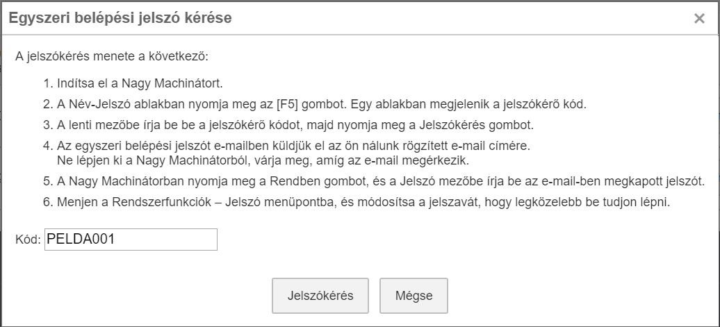 A Nagy Machinátorhoz lehetőség nyílt a honlapunkon (www.progen.hu) keresztül egyszeri belépési jelszót igényelni. Teljes jogosultságú jelszót csak olyan ügyfél tud kérni, aki programérvényesítés joggal rendelkezik. Ebben az esetben tudjuk Önnek vagy az Ön munkatársának elküldeni a megadott e-mail címre az egyszeri teljes jogosultságú jelszót. Ez a jelszó olyan bejelentkezést biztosít a felhasználó számára, mellyel megkapja a BIGMAC menüt és a hozzá tartozó összes funkciót, mint például menü módosítás, felhasználói jogosultságok szabályozása stb. Ebből adódóan, ha belépünk az egyszeri jelszóval, akkor célszerű a saját felhasználói profilunkat megváltoztatni. Ilyen esetek lehetnek, ha például elfelejtettük jelszavunkat és nincs menü módosítás funkció az általunk használt menüben.