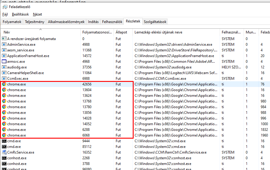 A Részletek fülön az chrome.exe folyamatot le kellett állítani a port felszabításához.