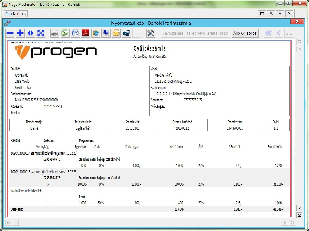 A számla nyomtatásakor az egyes teljesítések külön, időrendi sorrendben kerülnek kinyomtatásra, teljesítésenként az áfa összesítővel és az áthárított adó összegének forintban történő feltüntetésével. Minden egyes szállítólevél egy ügyletnek minősül.