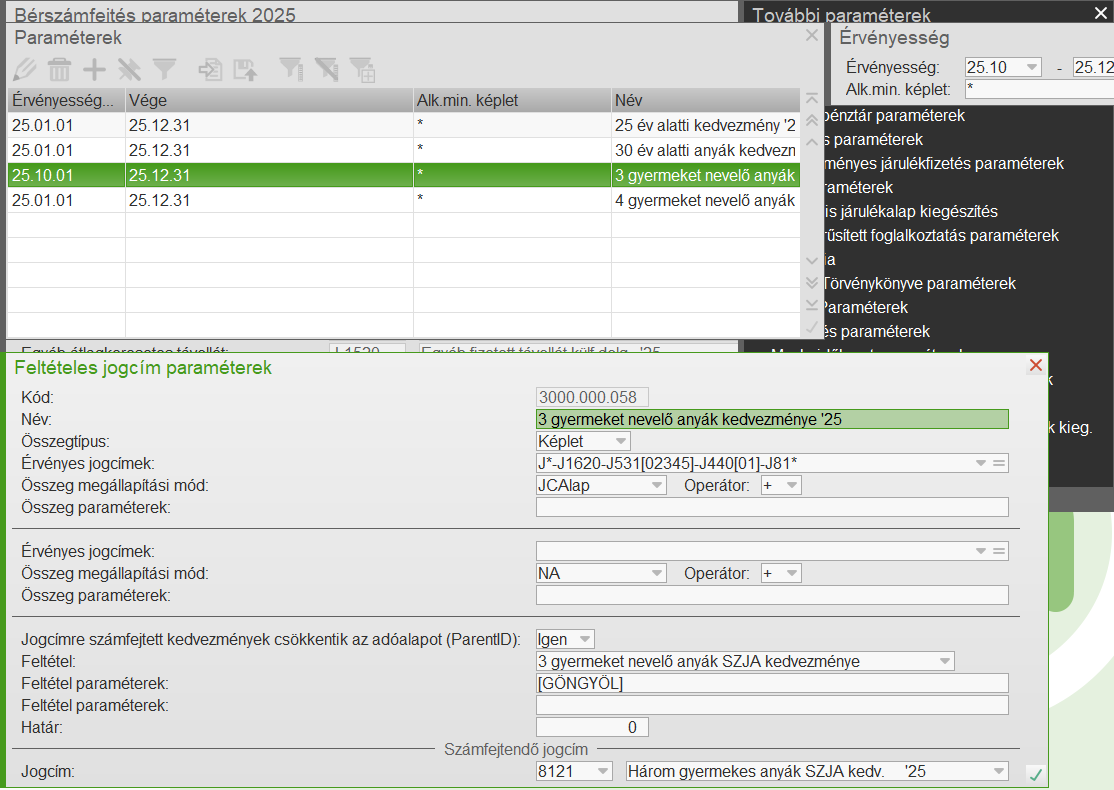 A Számfejtés paraméterek / Dátum és Alkmin függő paraméterek / Feltételes jogcímek blokkban kerül definiálásra.