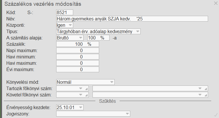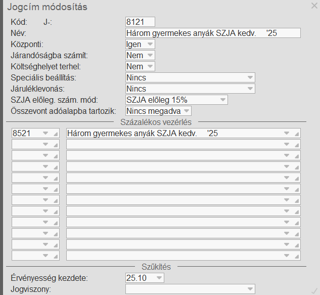 A jogcímképlet szerkeszthető, egyéni jogcímekkel kiegészíthető.