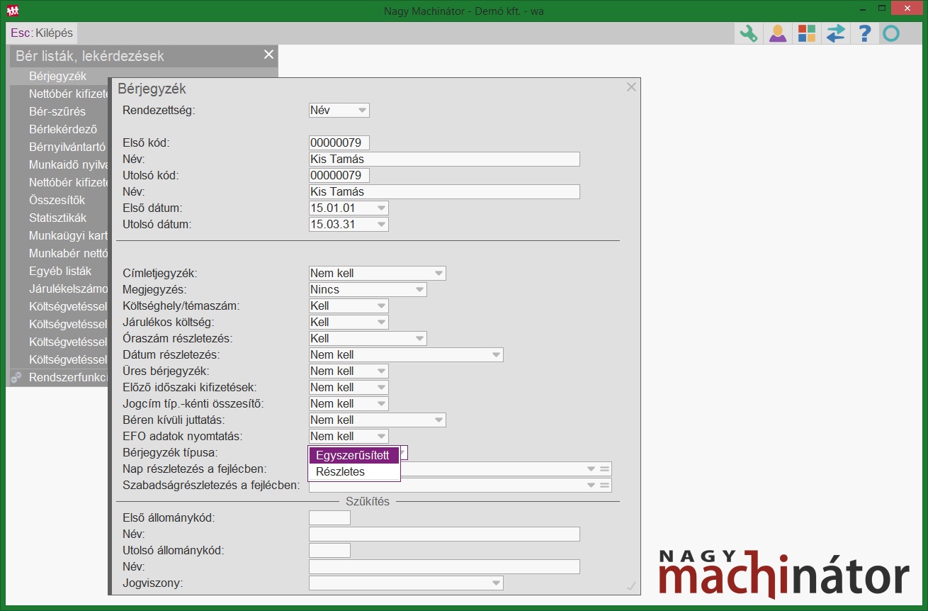 A bérjegyzék lekérhető Egyszerűsített vagy Részletes formátumban. A Számfejtés paraméterek / Munkaidőkeret paraméterek menüpontban egy jogcímképlettel szabályozható, hogy Egyszerűsített módban mely jogcímek jelenjenek meg a bérjegyzéken.