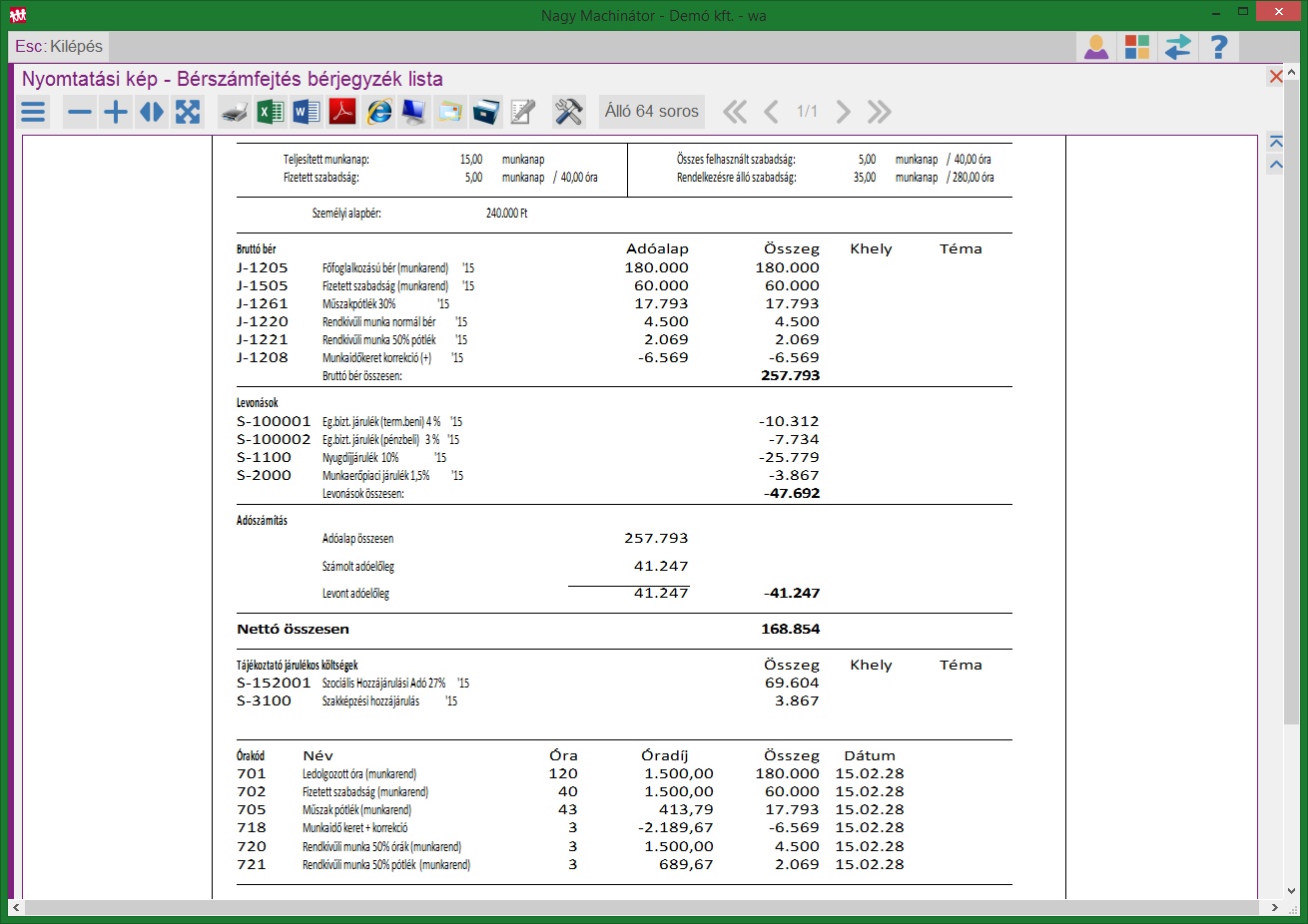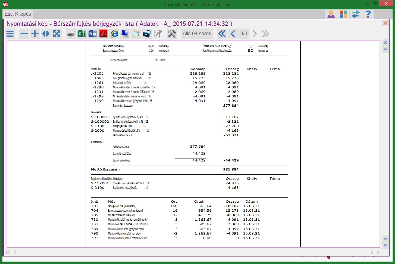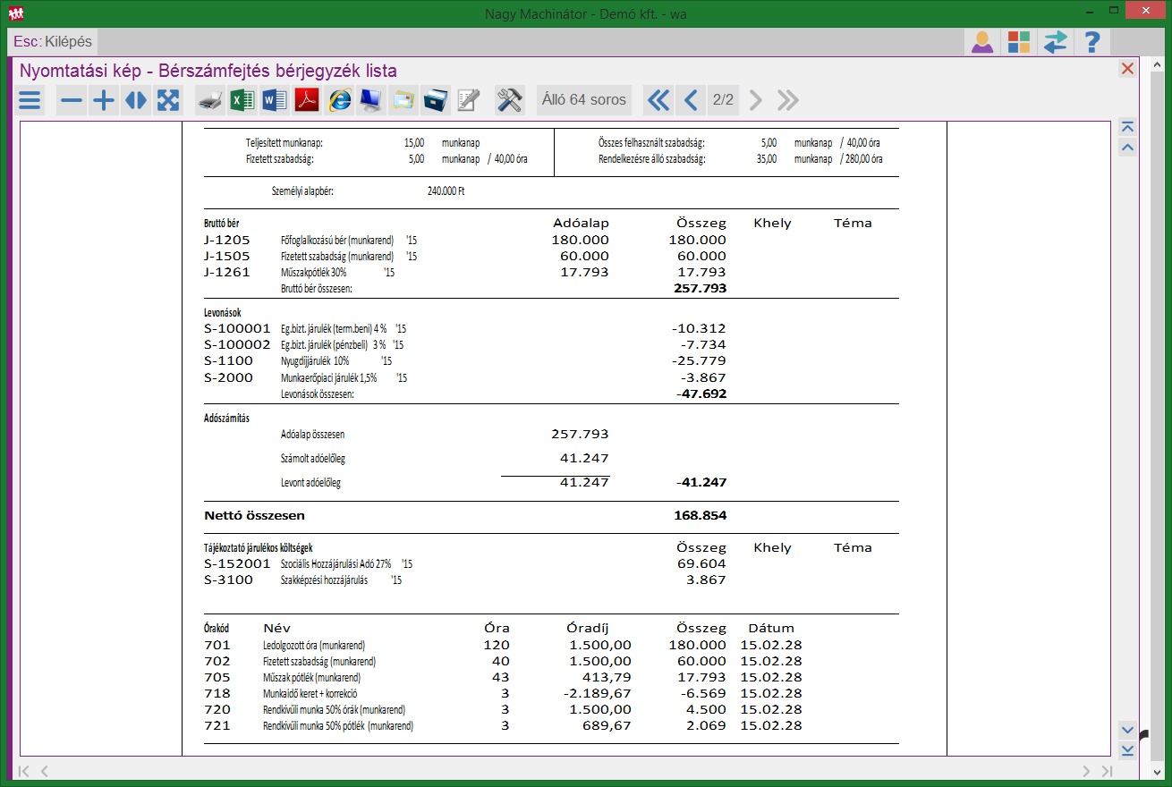 - az óraelszámolás részletesen tartalmazza az órákat (ha nem szeretnénk, hogy ez látszódjon, akkor Óraszám részletezés nélkül kérjük le a bérjegyzéket)