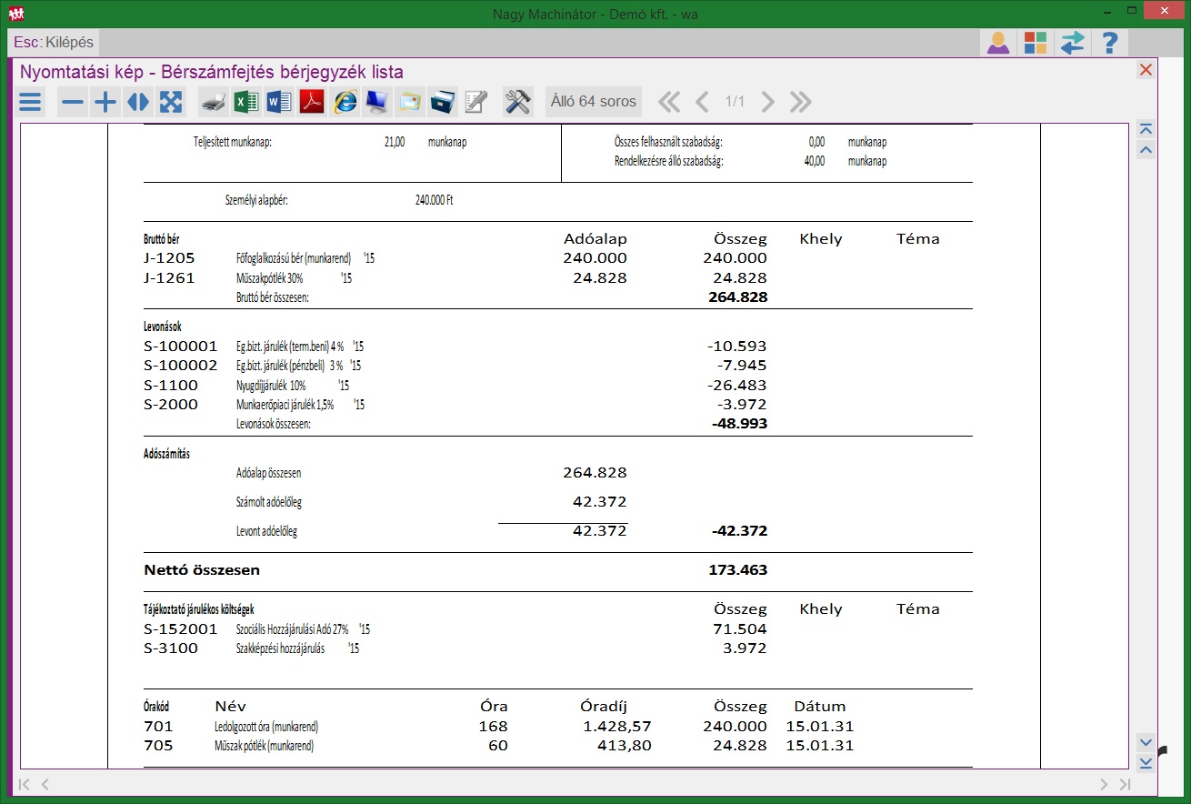 Január (mivel a dolgozónak nem volt semmi olyan jogcíme, amely korrekciót igényelne a munkaidőkeret szempontjából, ezért mindegy melyik formátumban kérjük le a bérjegyzéket)