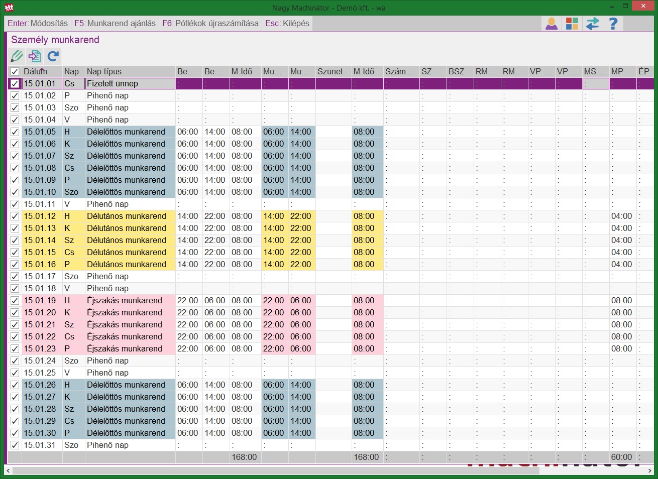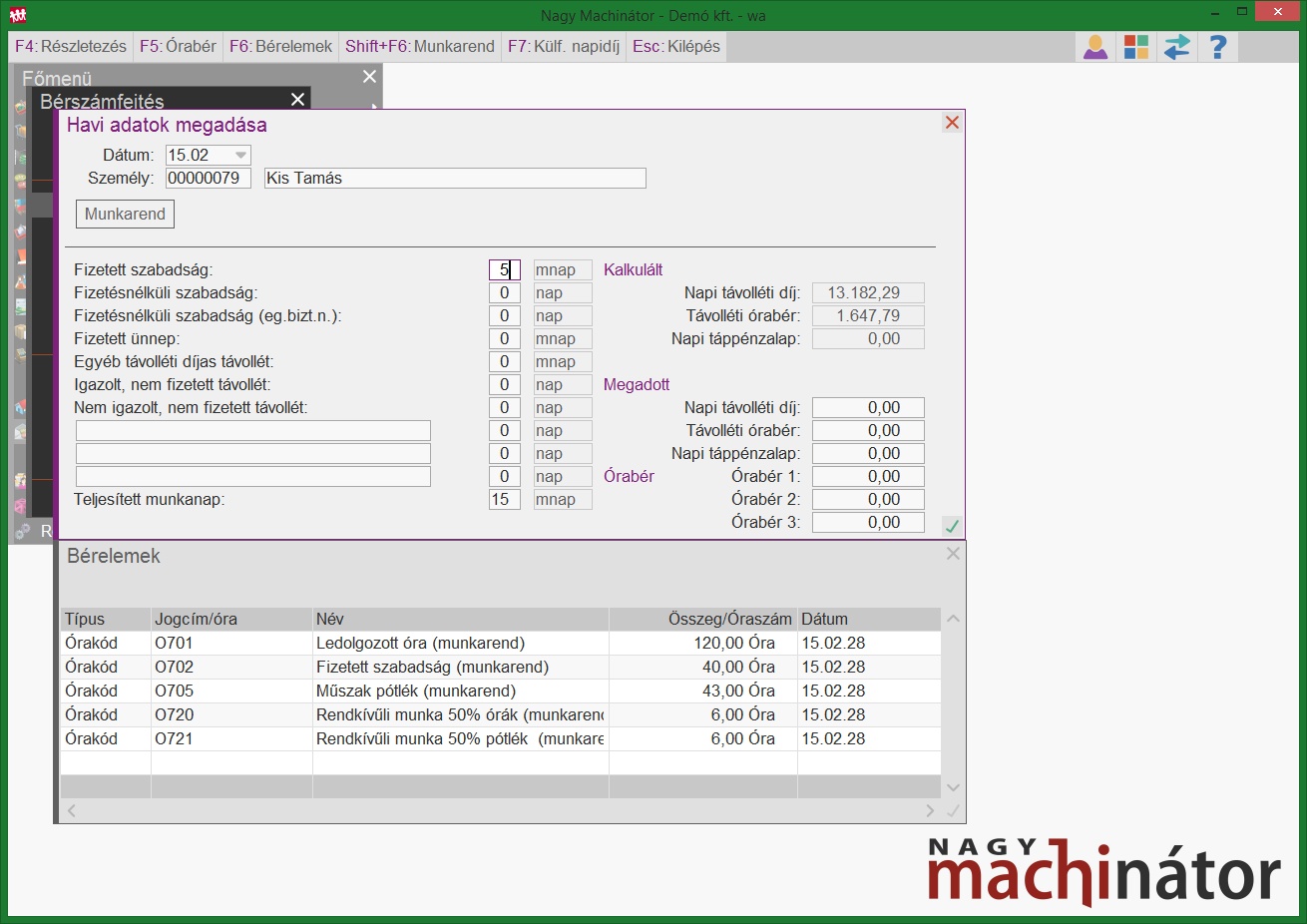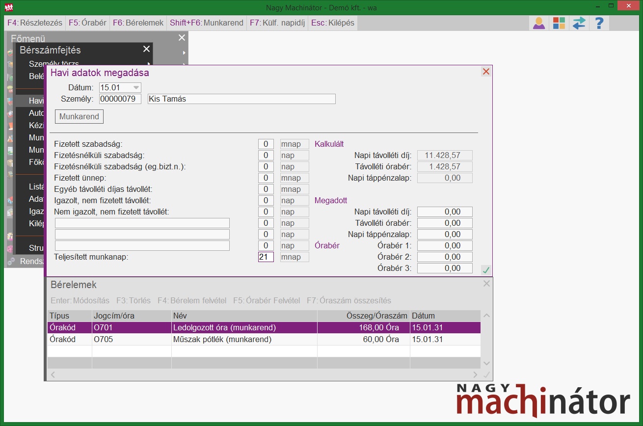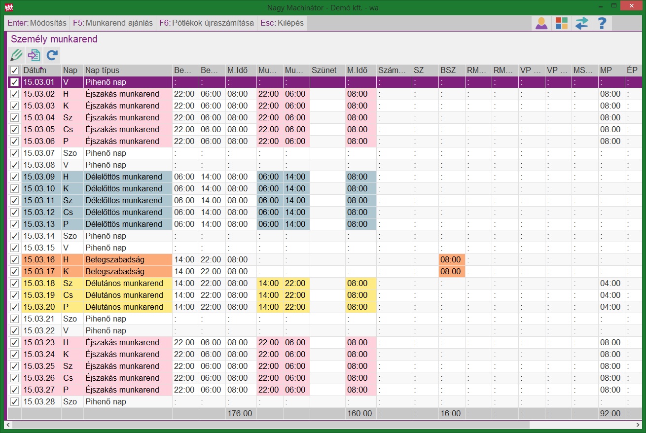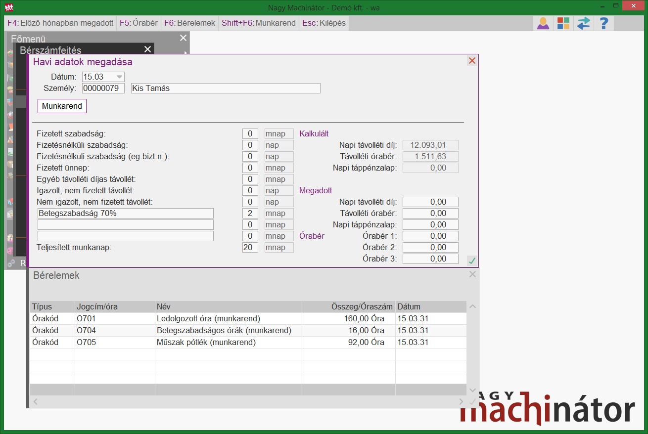 A munkarend rögzítése után a program automatikusan legenerálja a ledolgozott órák számát, és jelen esetben a műszakpótlékos órák számát. Ezek a program által generált sorok nem módosíthatóak, de egyéb bérelem, vagy órakód felvehető mellé.