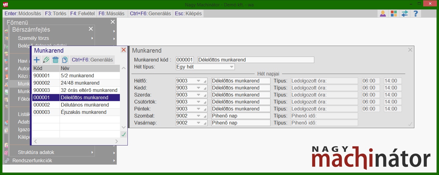 Először fel kell venni a három féle munkarendet. Ha a "klasszikus" beosztás szerint dolgoznak, akkor használhatjuk a programban központilag szereplő nap típusokat a munkarend kialakításához. Ha nem, akkor előbb fel kell vennünk a megfelelő naptípusokat.