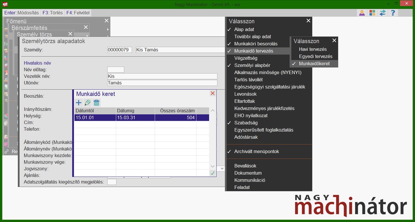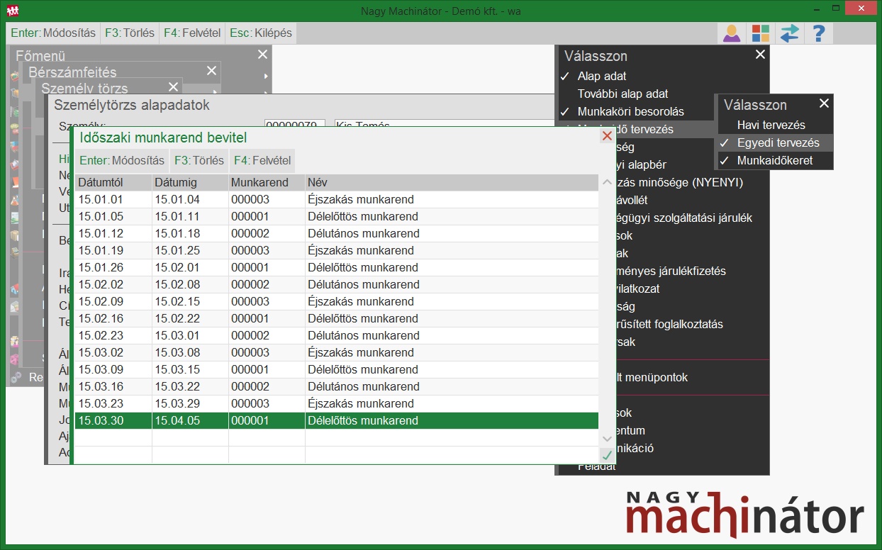 Dolgozó három műszakban dolgozik hétfőtől péntekig. A munkaidőkeret 2015.01.01. - 2015.03.01.-ig tart, 504 óra a munkaidőkeret össz. óraszáma. Havibéres, havi bére: 240.000 Ft