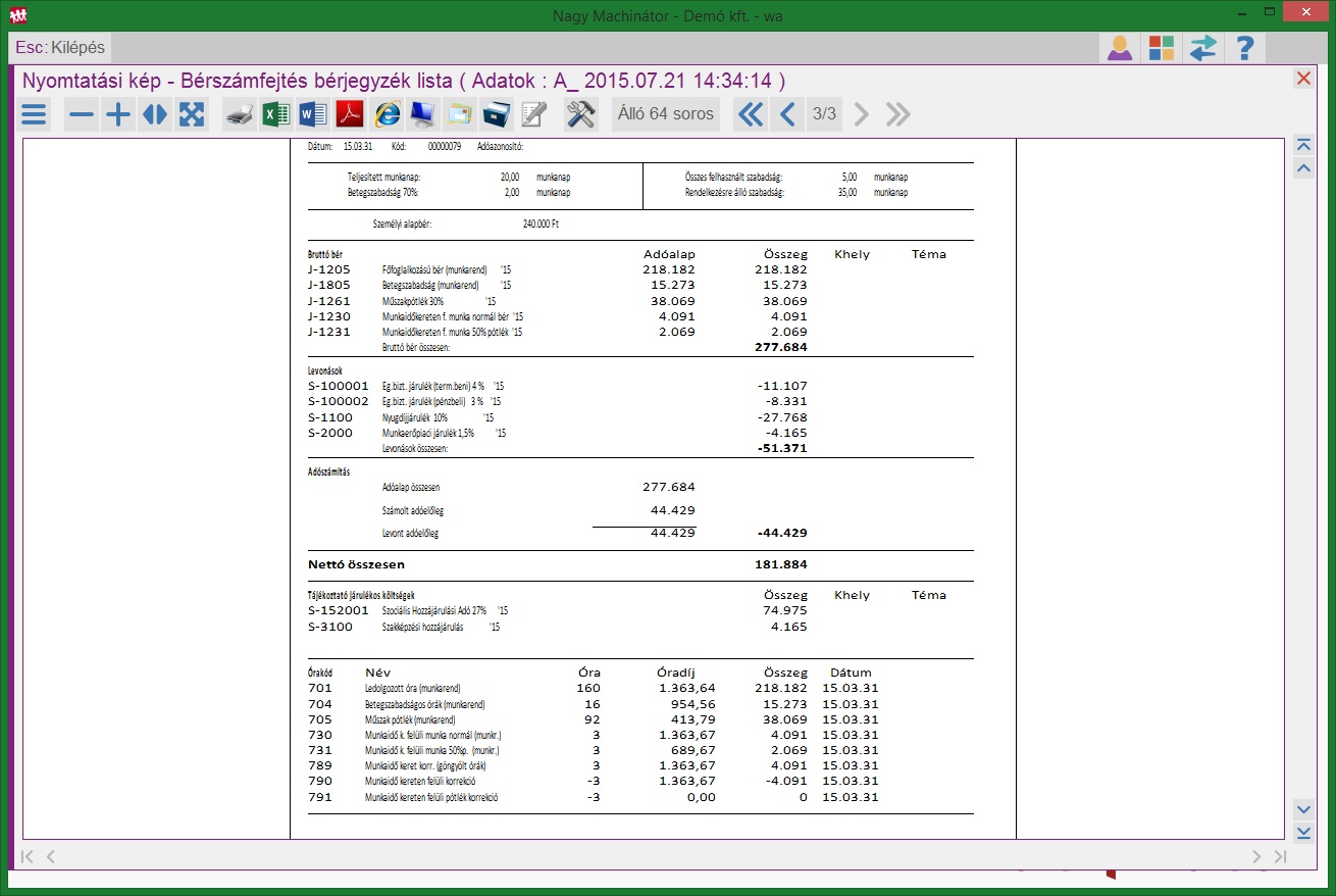 - a részletes bérjegyzéken látható minden jogcím, amely számfejtésre került, így pl a Rendkívüli munkáért járó összeg a pótlékkal együtt, valamint, az, hogy mivel munkaidőkeret meg van adva, ezért ezzel az összeggel korrigálásra kerül a számfejtés, mivel a túlórák csak a munkaidőkeret végén, elszámoláskor kerülnek számolásra göngyölítve.