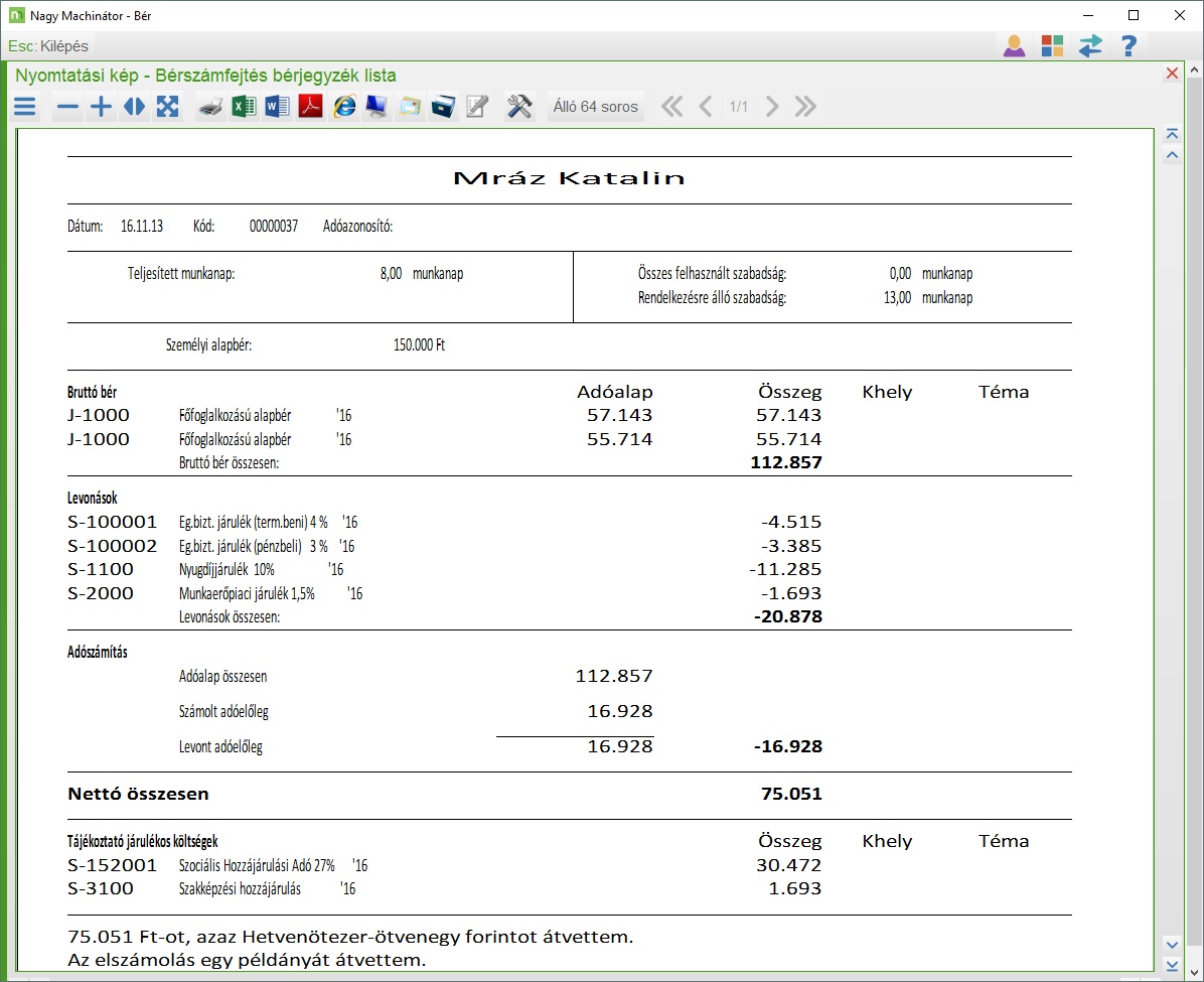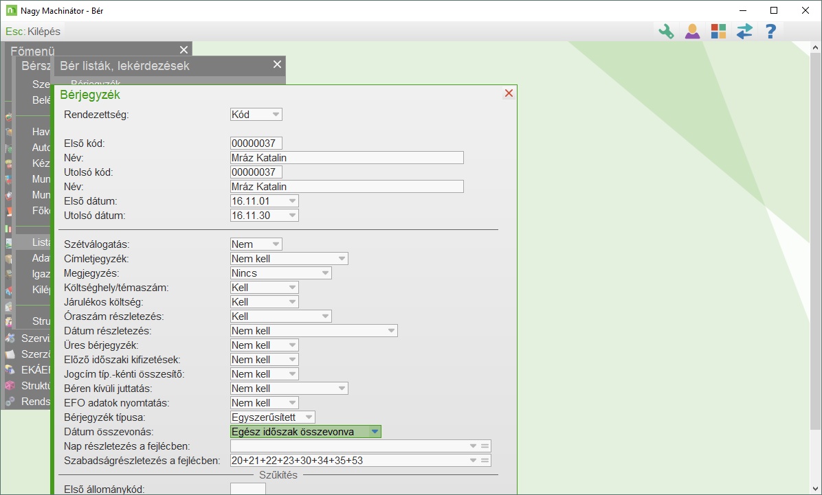 Számfejtéskor pedig úgy kell eljárnunk, hogy készítünk egy számfejtést 2016.11.13-ra az első jogviszonyban ,majd 2016.11.30-ra a második jogviszonyban. Ekkor a ledolgozott napok és a rögzített havi adatok alapján a program automatikusan kiszámolja az arányosan járó béreket. A bérjegyzéket az alábbi módon lekérve egy oldalon fogjuk látni a dolgozó havi bérét.