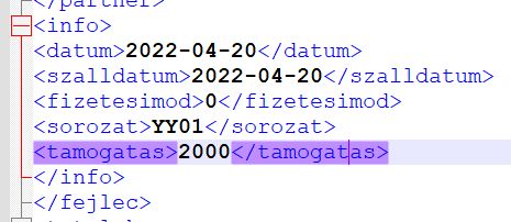 A WEB-ről érkező XML fáj <info> blokkjában kell megadni <tamogatas> címkével támogatás összegét.