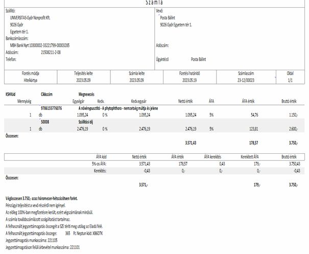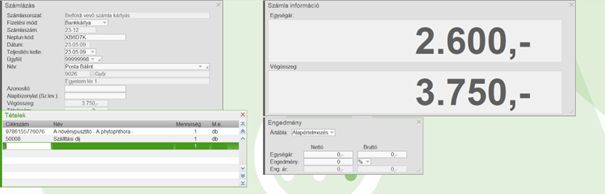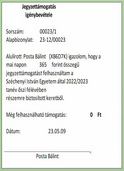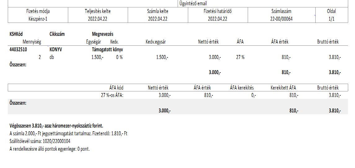 A formázott számlaképen megjeleníthető a támogatás összege vagy egy, az összeget is tartalmazó szöveges megjegyzés (utóbbi látható a képen).