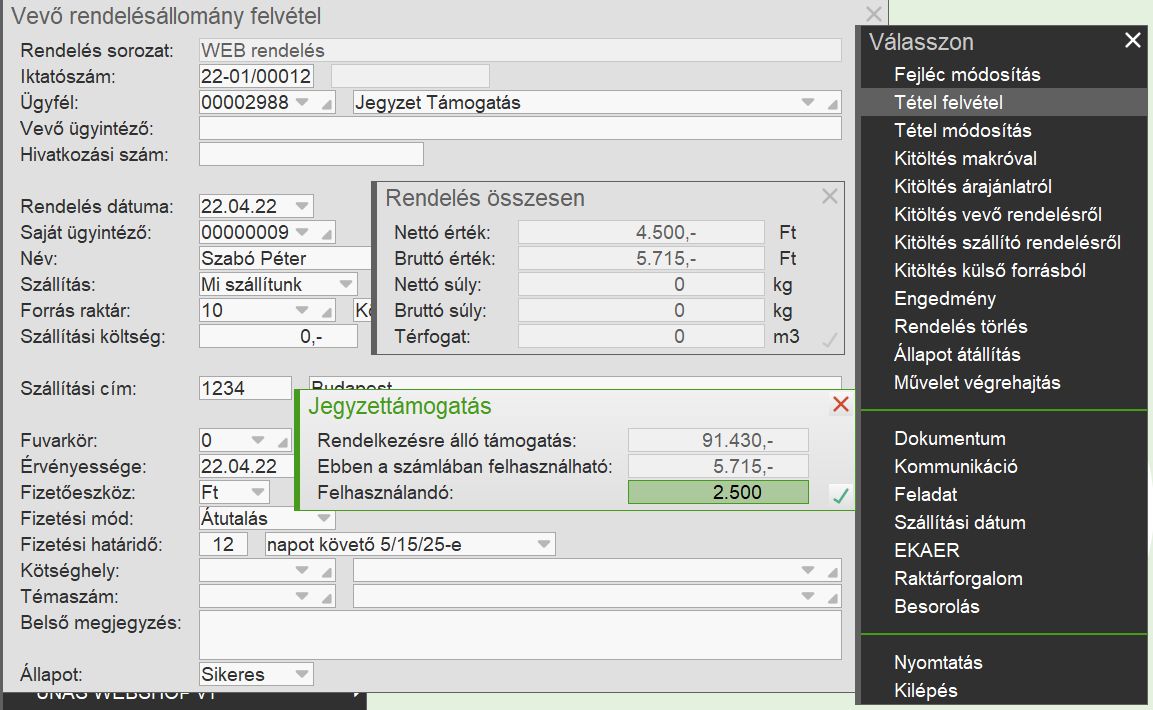 Támogatást tartalmazó rendelés, ill számla lezárása után a bizonylaton szereplő érték bekerül a JegyzetTFel adatállományba a rendelés és/vagy a számla számával és levonódik a JegyzetTKer adatállományban tárolt keretösszegből.