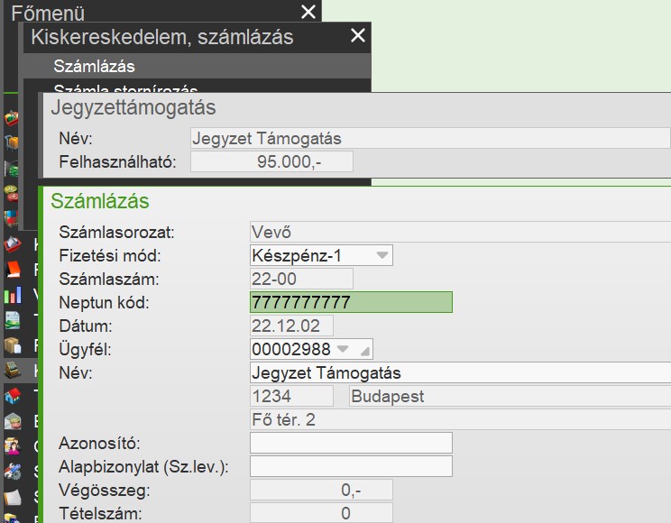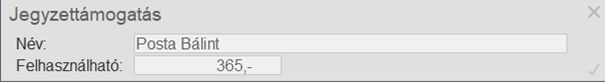 Az adóügyi nyomtatóval készült bizonylatok is kezelik a jegyzettámogatást. A nyomtató paraméterezésében megadható a Jegyzet tám. fizetési mód. Ha a számla lezáráskor adunk meg jegyzet támogatást, akkor fizetéskor kapunk egy infó ablakot, mely szerint A jegyzet támogatás összege, azaz xxx forint levonásra kerül a végösszegből!. A jegyzettámogatás megjelenik a fizetési gombsorban is (ha van az ügyfélnek kerete).
