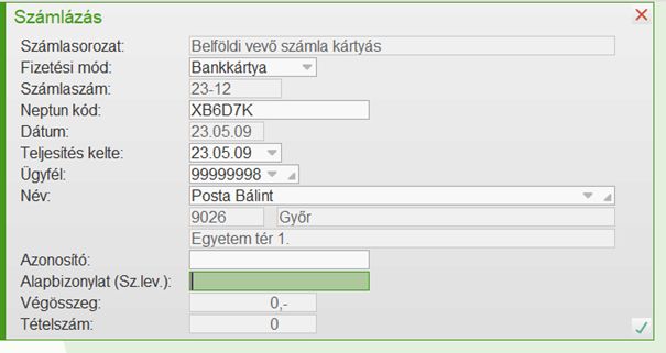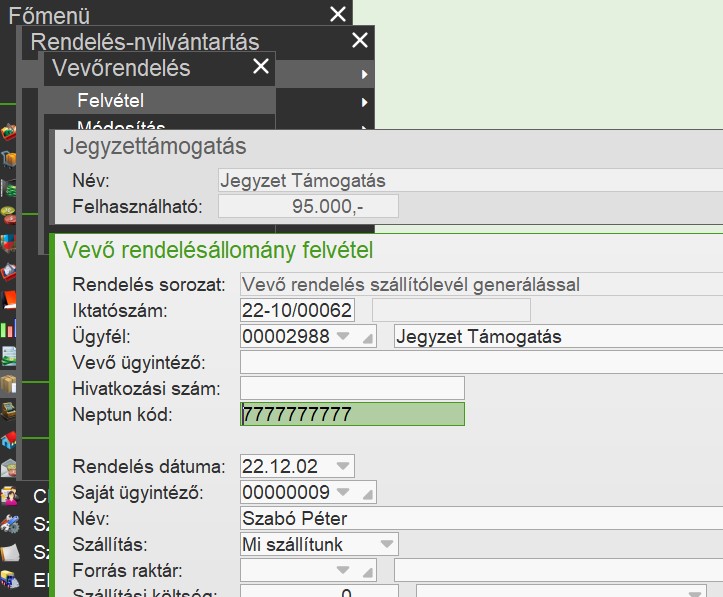 A NEPTUN kód megadható a rendelés bevitelben az Ajánlati szám mezőben, míg a kisker számlában az Alapbizonylat mezőben (mindkettőben Neptun kód a címke). Amennyiben olyan kódot adunk meg, amelyre szerepel rekord a JegyzetTKer állományban, a program megjeleníti a NEPTUN (EAN) kódhoz tartozó nevet és még felhasználható keretösszeget.